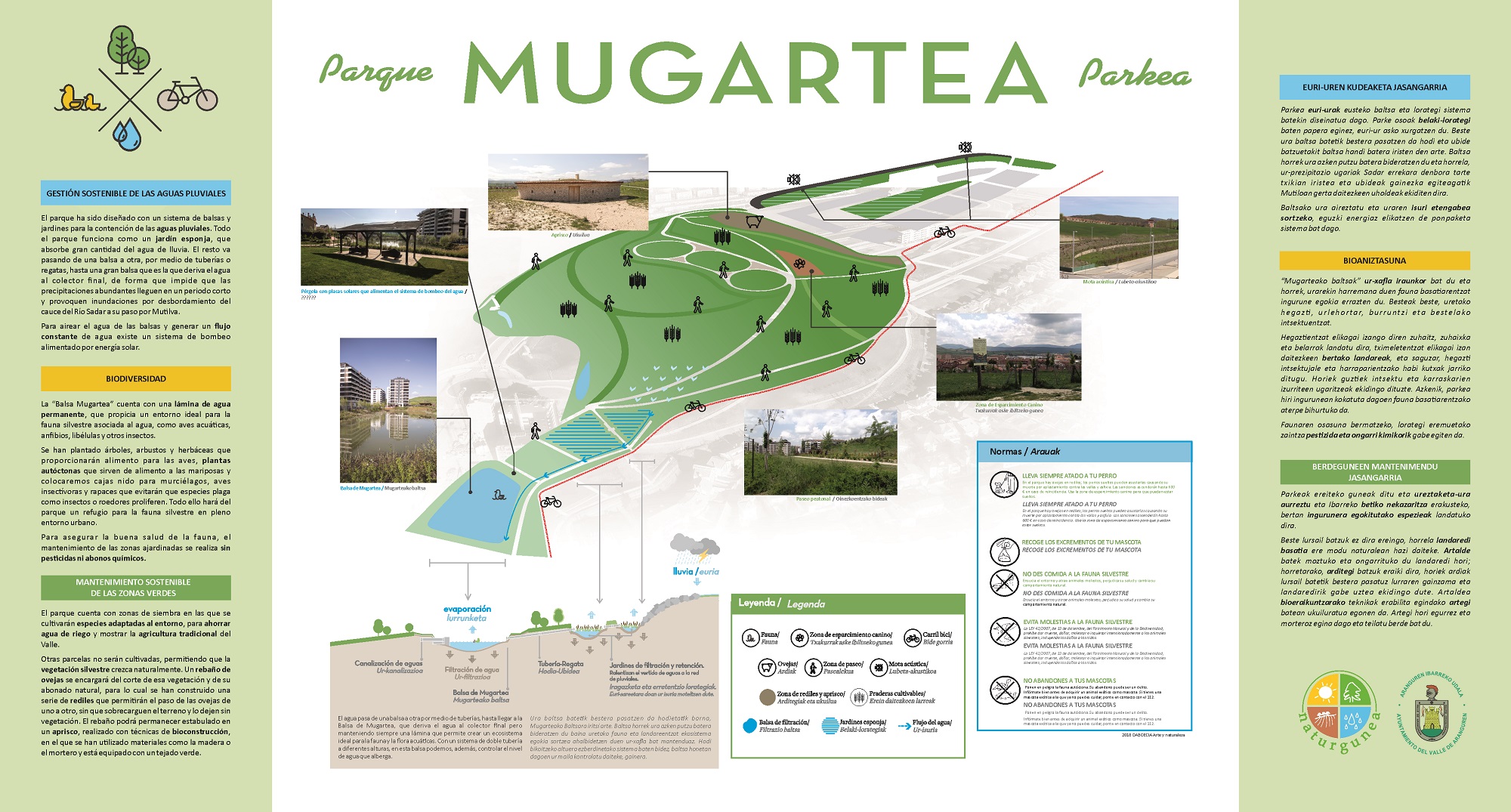El tercer proyecto premiado, “Urbanización Sector Mugartea”, aborda la gestión sostenible de las aguas pluviales, de la jardinería y la conservación de la biodiversidad, en una urbanización concreta del Ayuntamiento del Valle de Aranguren, sustituyendo el sistema habitual de recogida de pluviales por uno de laminación.