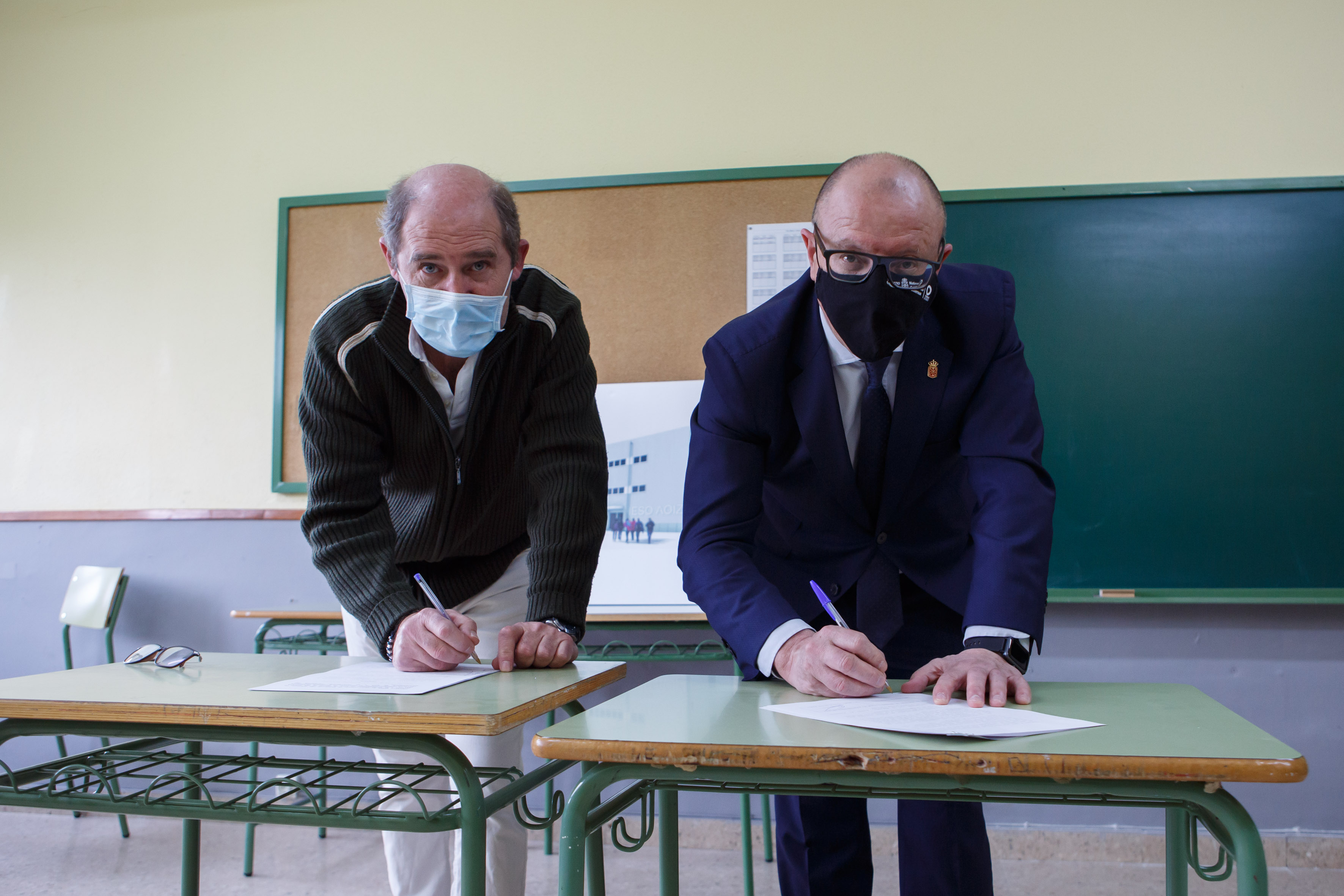 El consejero de Educación, Carlos Gimeno, y el alcalde de Aoiz / Agoitz, Ángel Martín Unzué, han firmado hoy un convenio de colaboración para la construcción del nuevo Instituto de Educación Secundaria Obligatoria. El Ayuntamiento pondrá a disposición del Departamento una parcela cercana al colegio público San Miguel para la construcción del centro que acogerá 300 alumnos y alumnas y contará con una inversión de 2.891.427,86 euros.