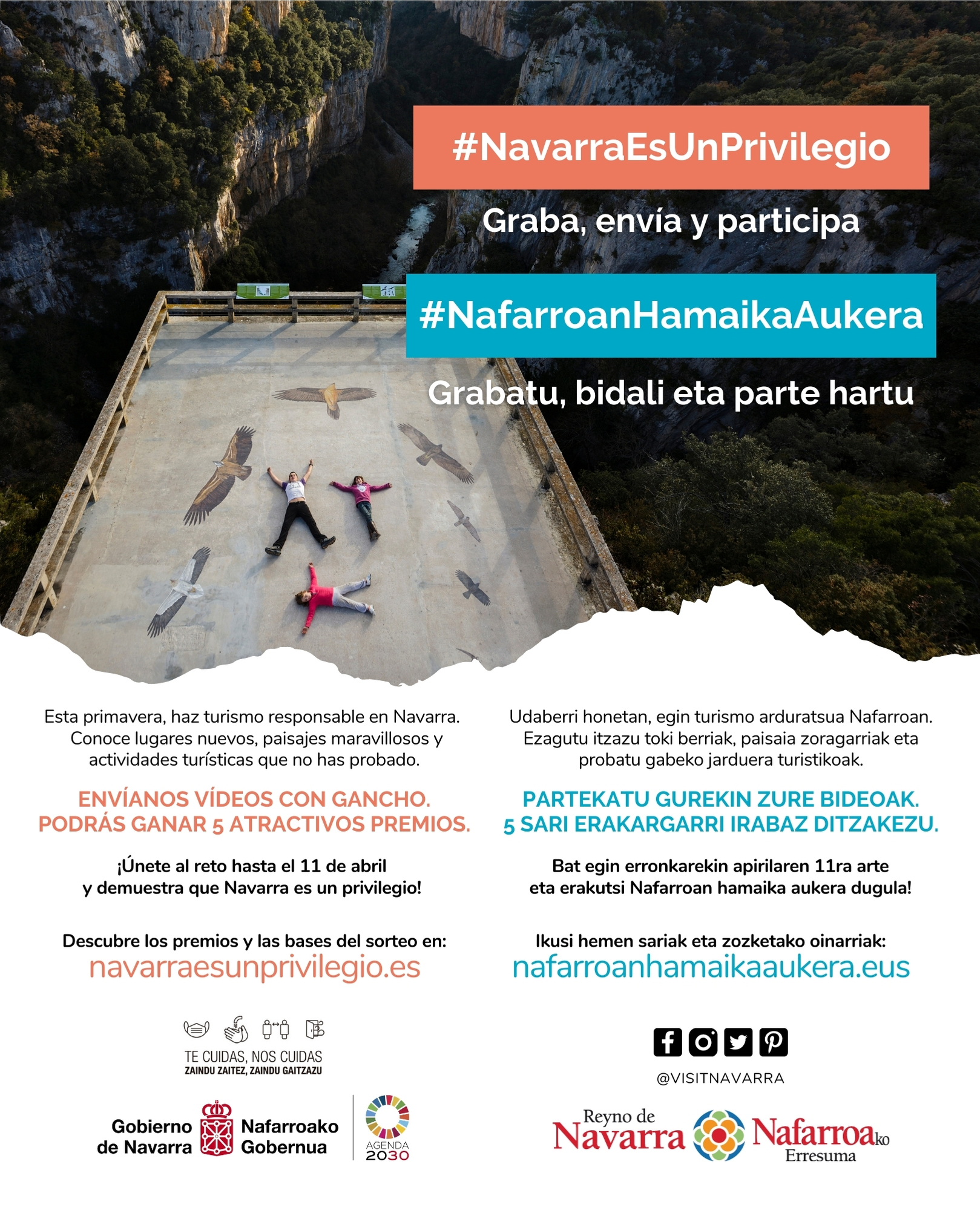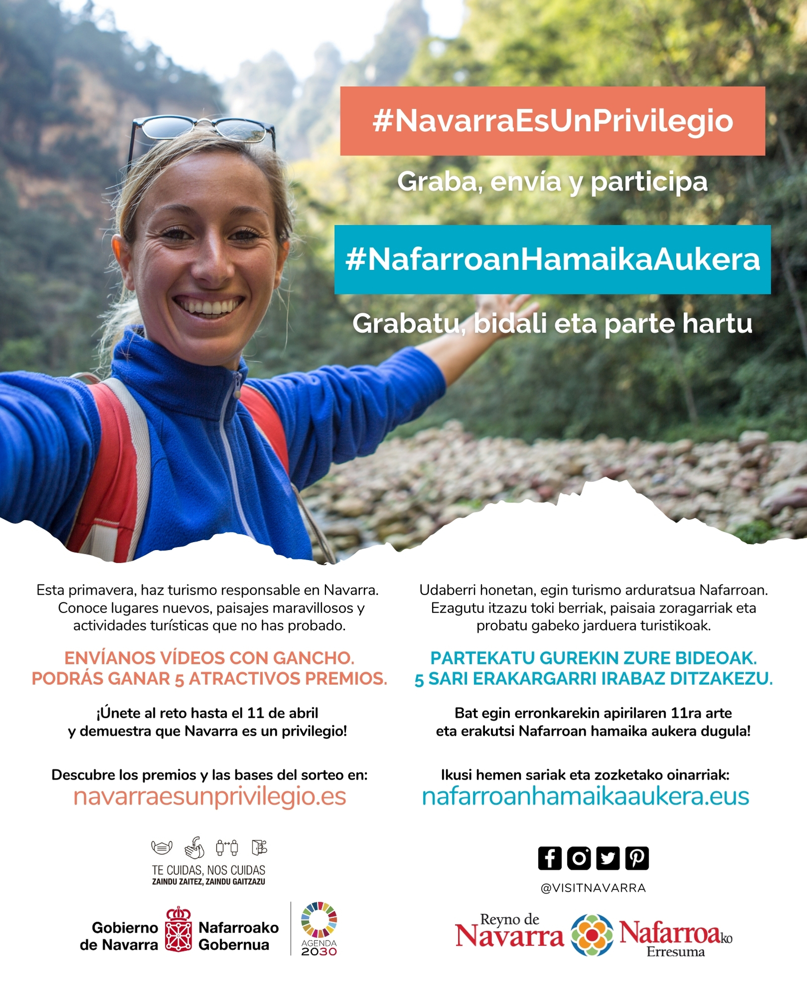 Las bases y dinámica del concurso se pueden consultar en la web navarraresunprivilegio.es y nafarroanhamaikaaukera.eus. Los vídeos serán los protagonistas de una acción colaborativa en la que participarán las personas que mejor conocen Navarra, “sus habitantes enseñarán al mundo los lugares y actividades que les esperan en esta tierra, nuestra diversidad, riqueza natural, patrimonial y cultural” han indicado los promotores de la campaña.