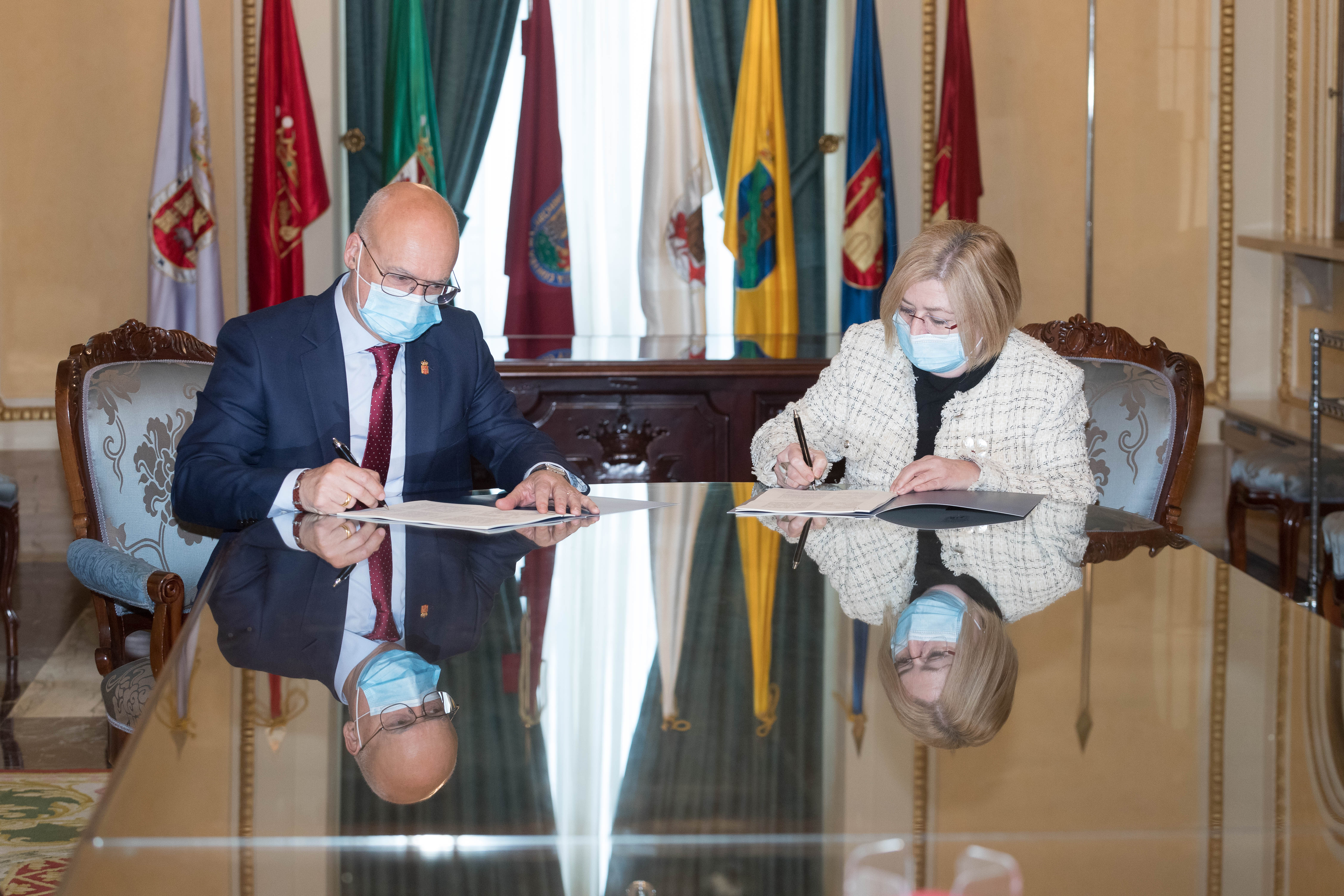 El consejero de Cohesión Territorial, Bernardo Ciriza, y la diputada de Infraestructuras Viarias y Movilidad de la Diputación Foral de Araba/ Álava, Blanca de la Peña, han firmado hoy en Vitoria-Gasteiz un convenio de colaboración, con el objetivo de reforzar y mejorar el servicio público de transporte de viajeros por carretera en ambos territorios.