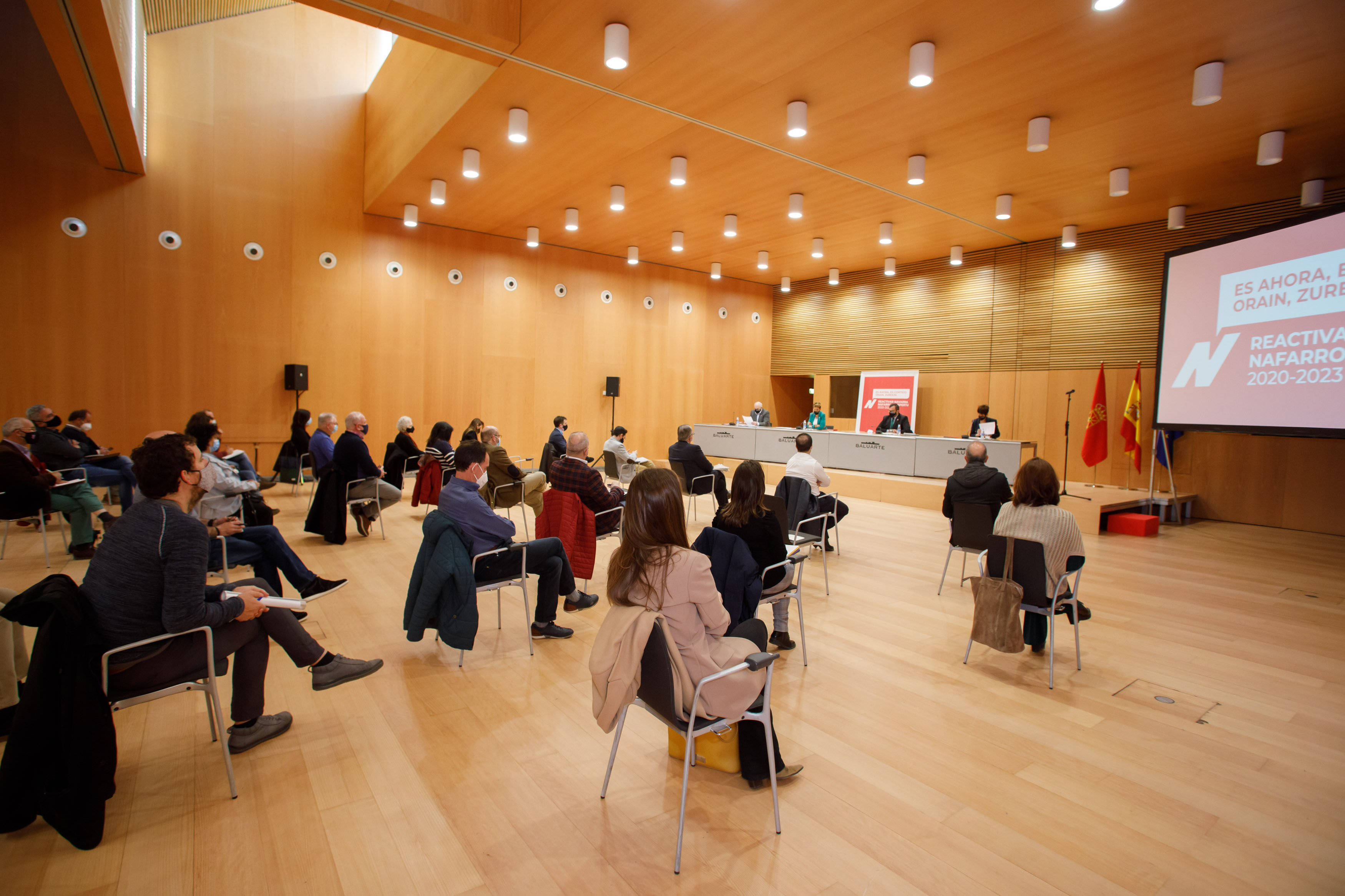 La Presidenta, que ha presentado las inversiones recogidas en el Plan Reactivar Navarra / Nafarrroa Suspertu y en los Presupuestos Generales de Navarra, ha estado acompañada por los dos vicepresidentes, Javier Remírez y José Mª Aierdi, y por la consejera de Economía y Hacienda, Elma Saiz, en un evento cuya apertura ha corrido a cargo del alcalde de Pamplona, Enrique Maya. Además, han participado miembros de la Federación de Municipios y Concejos y de la Mancomunidad de la Comarca de Pamplona.