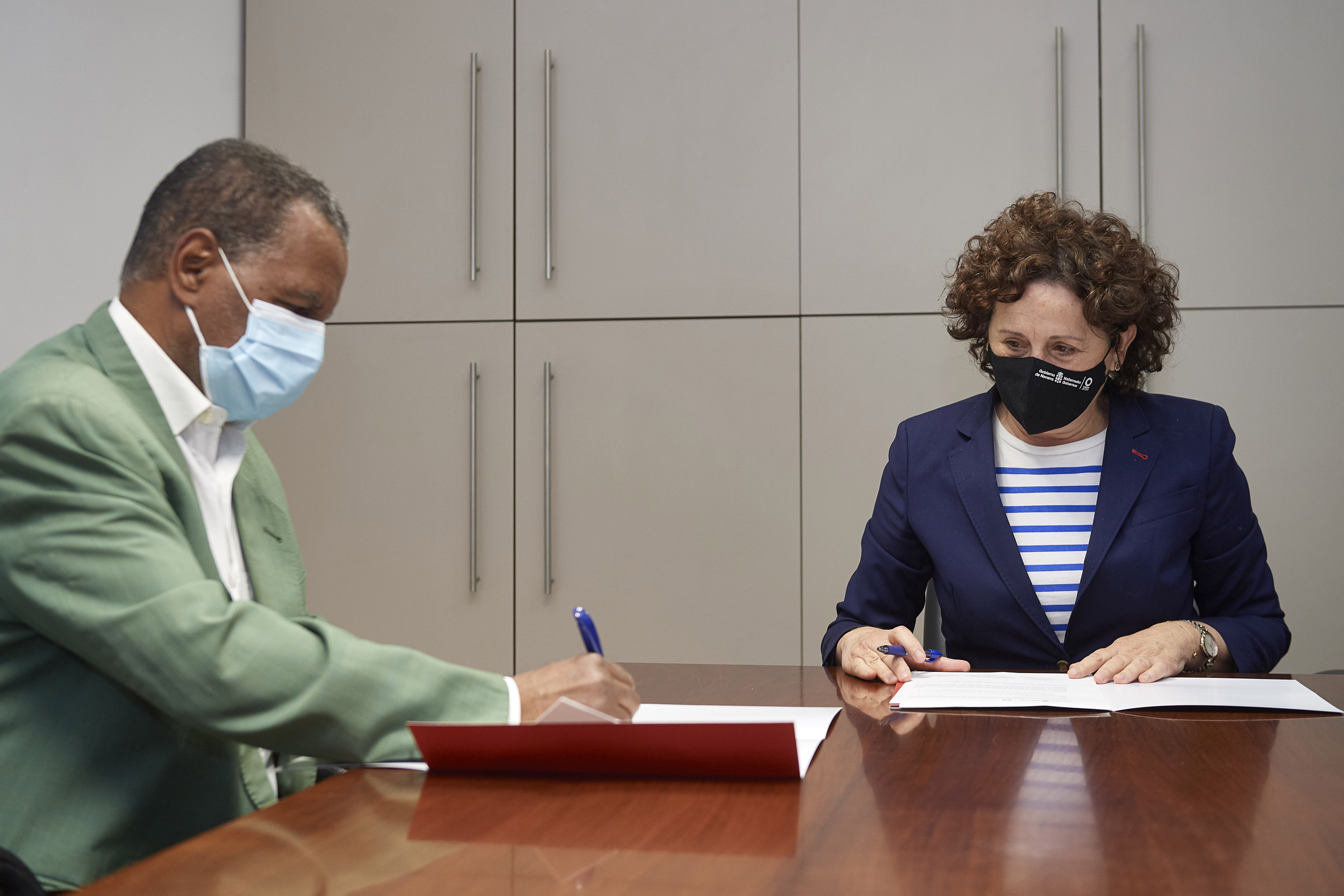 En la firma del convenio, que ha tenido lugar este lunes, han estado presentes, además de la consejera Maeztu y Andrés Carbonero, director general de Protección Social y Cooperación Internacional; Rosario Pardo Gaskue, coordinadora y representante de ANARASD; y Lehebib Abderrahaman Didi, representante de la Delegación Saharaui en Navarra y el subdelegado, Mohamed Gailany.