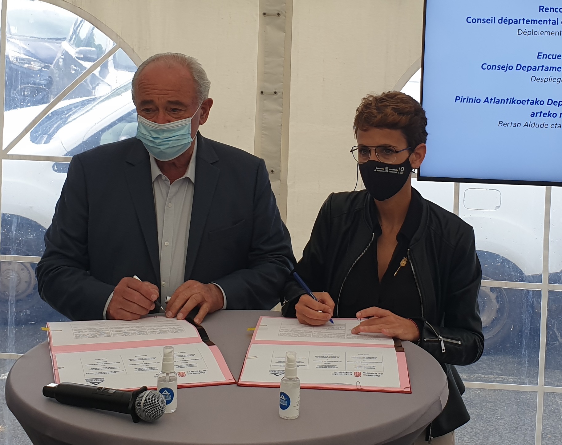 El Gobierno de Navarra y el departamento francés de Pirineos Atlánticos han renovado hoy un convenio de colaboración por el que se comprometen a trabajar juntos en materias como la mejora de la conectividad y la movilidad en la zona y el impulso y fomento de turismo transfronterizo. La Presidenta de Navarra, María Chivite, y el presidente de esta región, Jean Jacques Lasserre, han escenificado la firma del acuerdo en la localidad francesa de Esnazu.