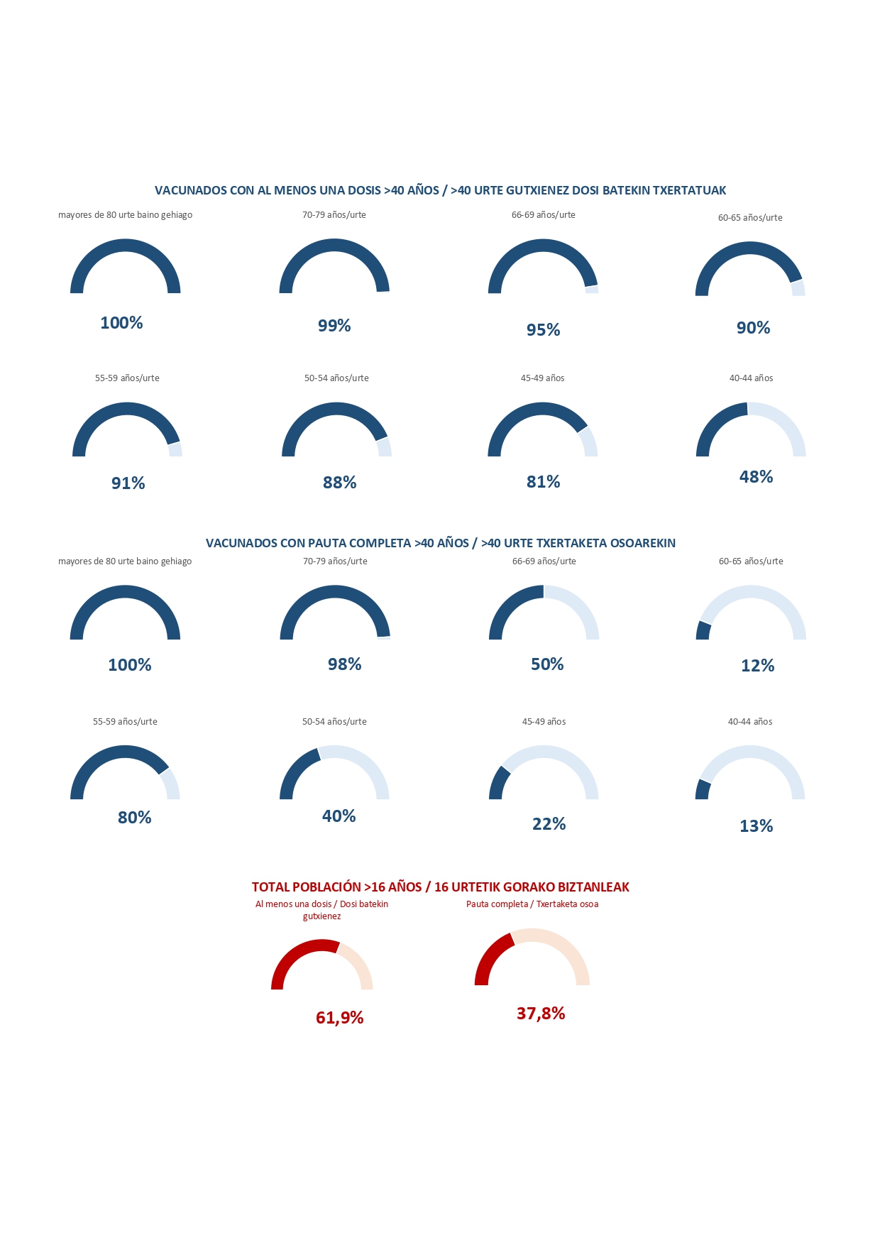 En cuanto a la cobertura por grupos de edad, se ha administrado la pauta completa al 100 % de mayores de 80 años y al 98% del grupo comprendido entre los 70 y los 79 años. Además, tienen la pauta completa el 50% de los de 66 a 69 años; el 12% de los de 60 a 65 años; el 80% de los de 55 a 59 años; el 40% de los de 50 a 54 años; el 22% de los de 45 a 49 años; y el 13% de los de 40 a 44 años.