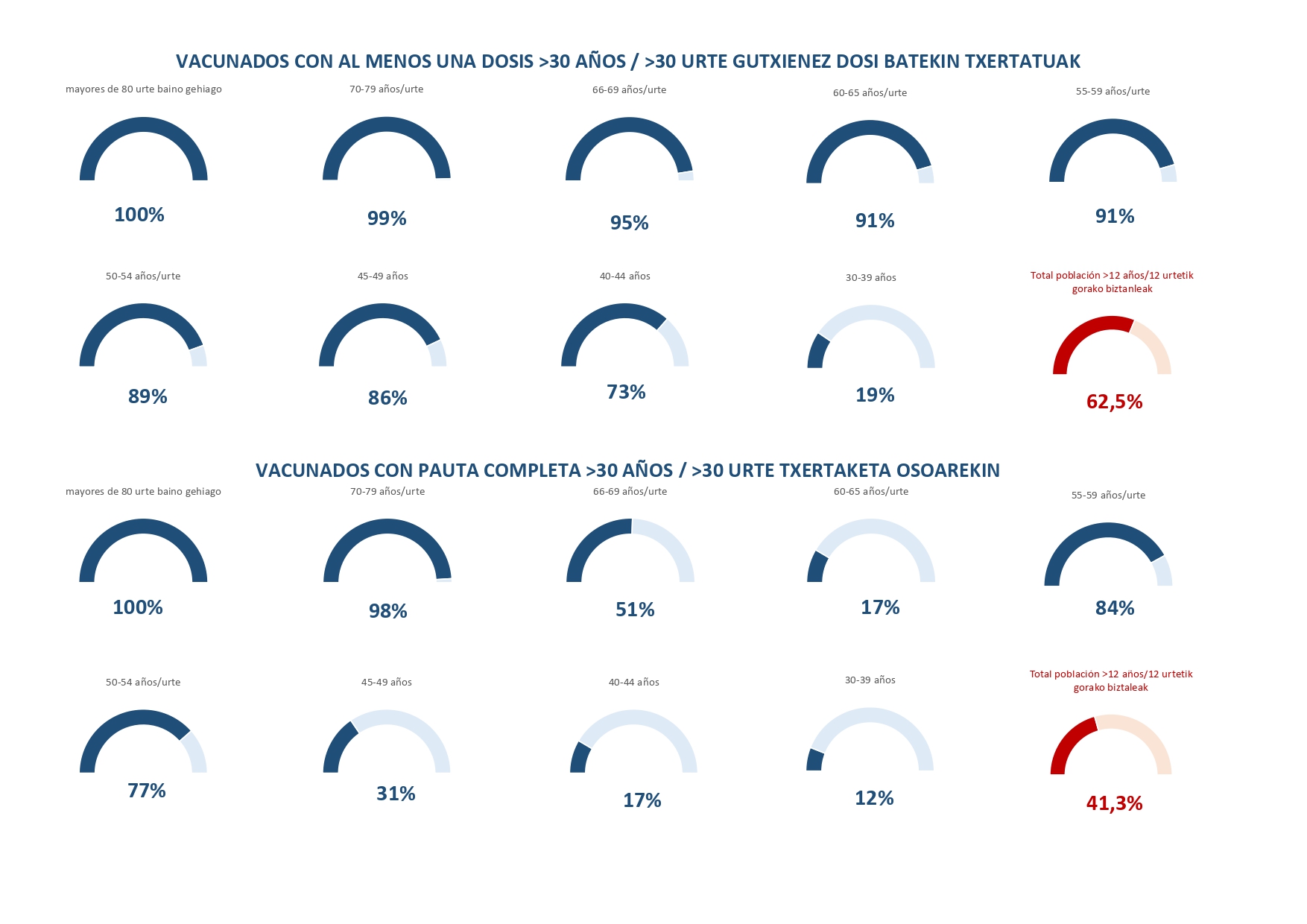 En cuanto a la cobertura por grupos de edad, se ha administrado la pauta completa al 100 % de mayores de 80 años y al 98% del grupo comprendido entre los 70 y los 79 años. Además, tienen la pauta completa el 51% de los de 66 a 69 años; el 17% de los de 60 a 65 años; el 84% de los de 55 a 59 años; el 77% de los de 50 a 54 años; el 31% de los de 45 a 49 años; el 17% de los de 40 a 44 años; y el 12% de 30 a 39 años.