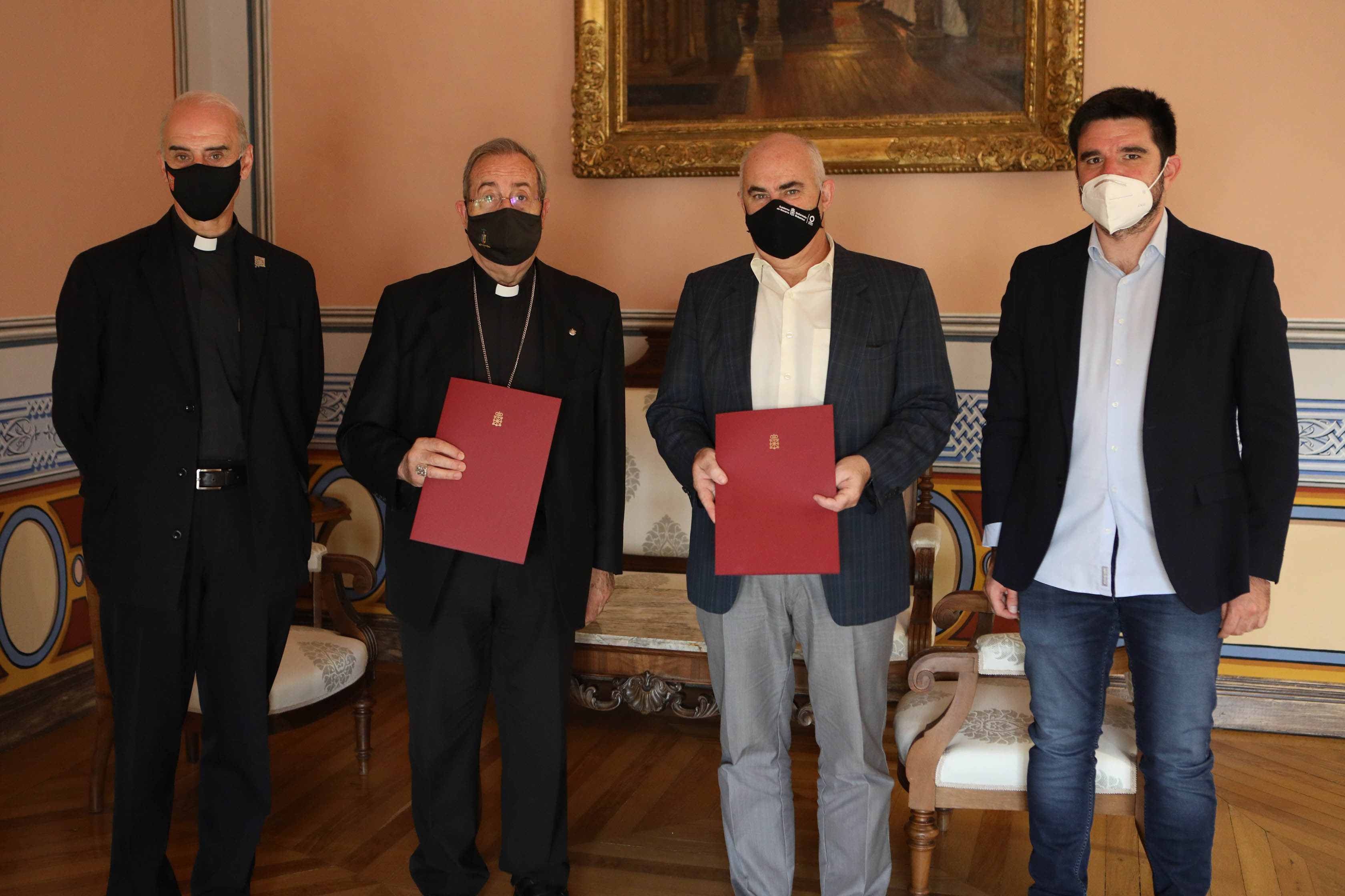 El vicepresidente y titular de Vivienda del Gobierno de Navarra, José Mª Aierdi, y el arzobispo de Pamplona / Iruña y Tudela, Francisco Pérez, han firmado hoy en el Palacio Episcopal de la capital navarra un convenio inédito hasta ahora por el que la Iglesia católica ha optado por ceder un número de viviendas de su patrimonio actualmente en desuso para que puedan ser arrendadas por medio del programa público de alquiler social que gestiona la sociedad pública Nasuvinsa.