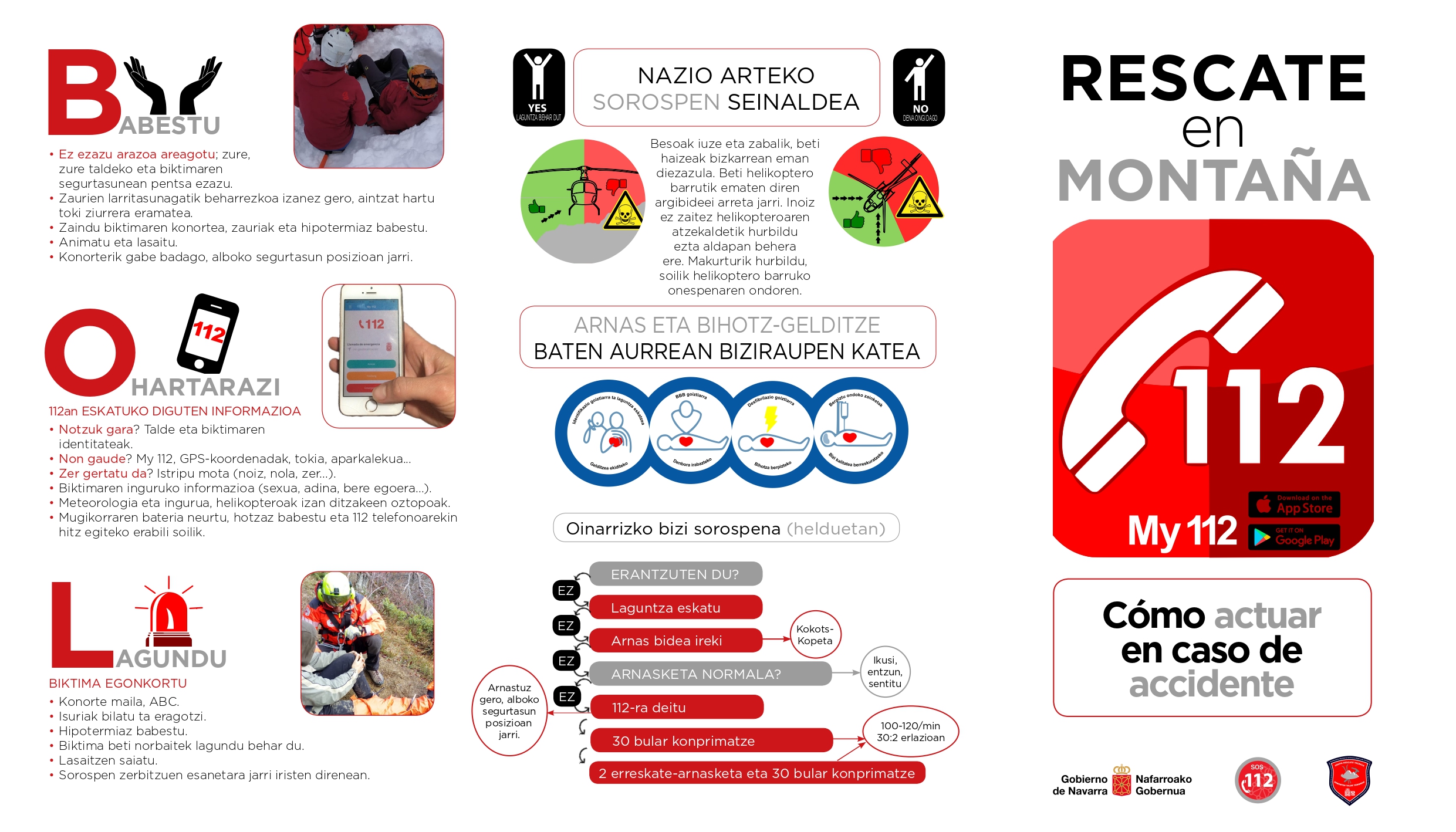 El documento, elaborado por el Grupo de Rescate Técnico (GRT) del Servicio de Bomberos de Navarra, está redactado en castellano-euskera y en inglés-francés, y expone a través de imágenes las acciones básicas a seguir en caso de sufrir un accidente: proteger, alertar y socorrer, que se conocen a través de las siglas PAS.