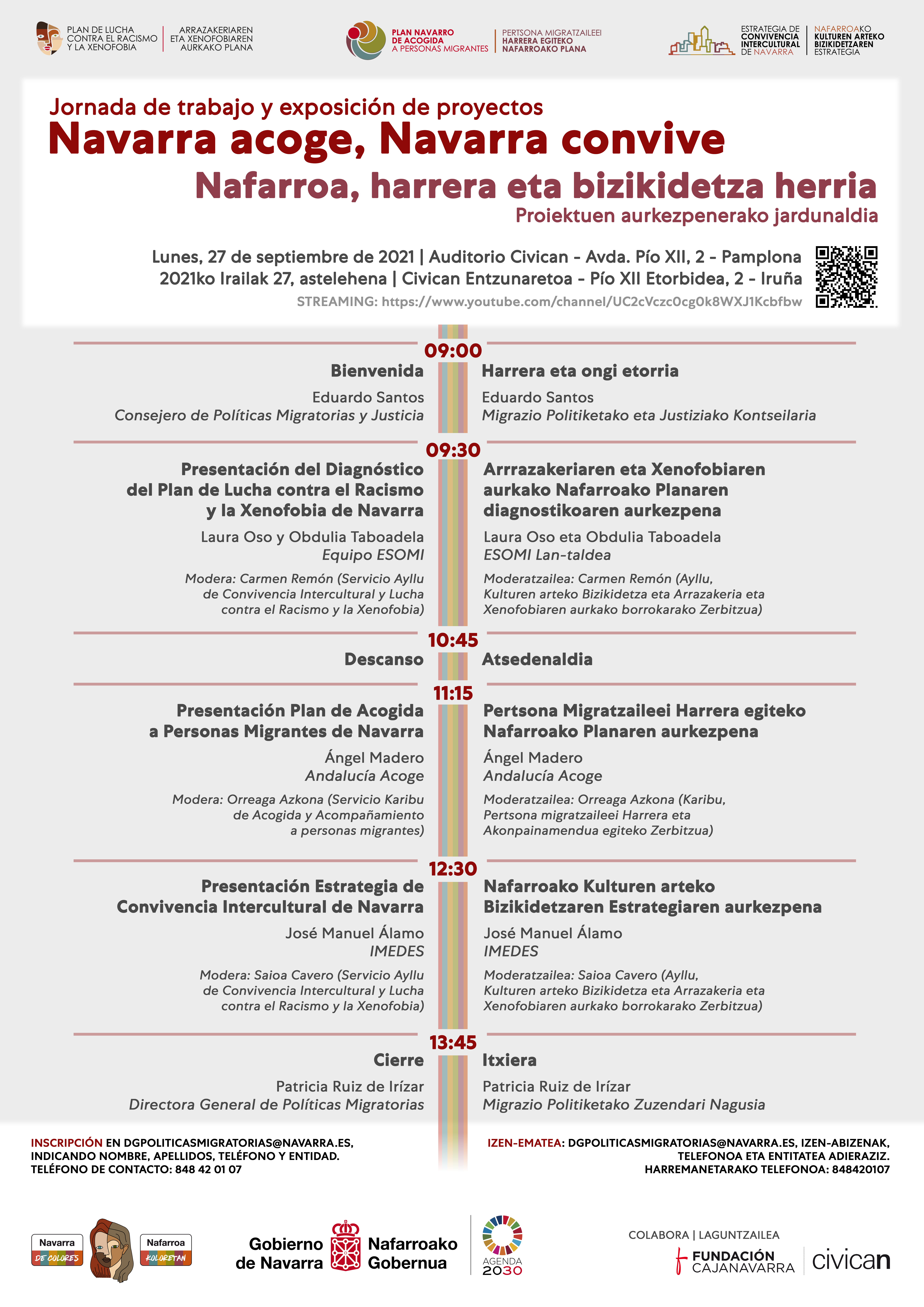 La presentación se llevará a cabo en una jornada que tendrá lugar en Pamplona, en el Civican de Pío XII, que podrá seguirse online a través de este enlace. En ella se dará a conocer también el diagnóstico elaborado durante los últimos meses, y de manera participativa, como fundamento para el Plan de Lucha contra el Racismo y la Xenofobia. La apertura del encuentro correrá a cargo del consejero de Políticas Migratorias y Justicia, Eduardo Santos.