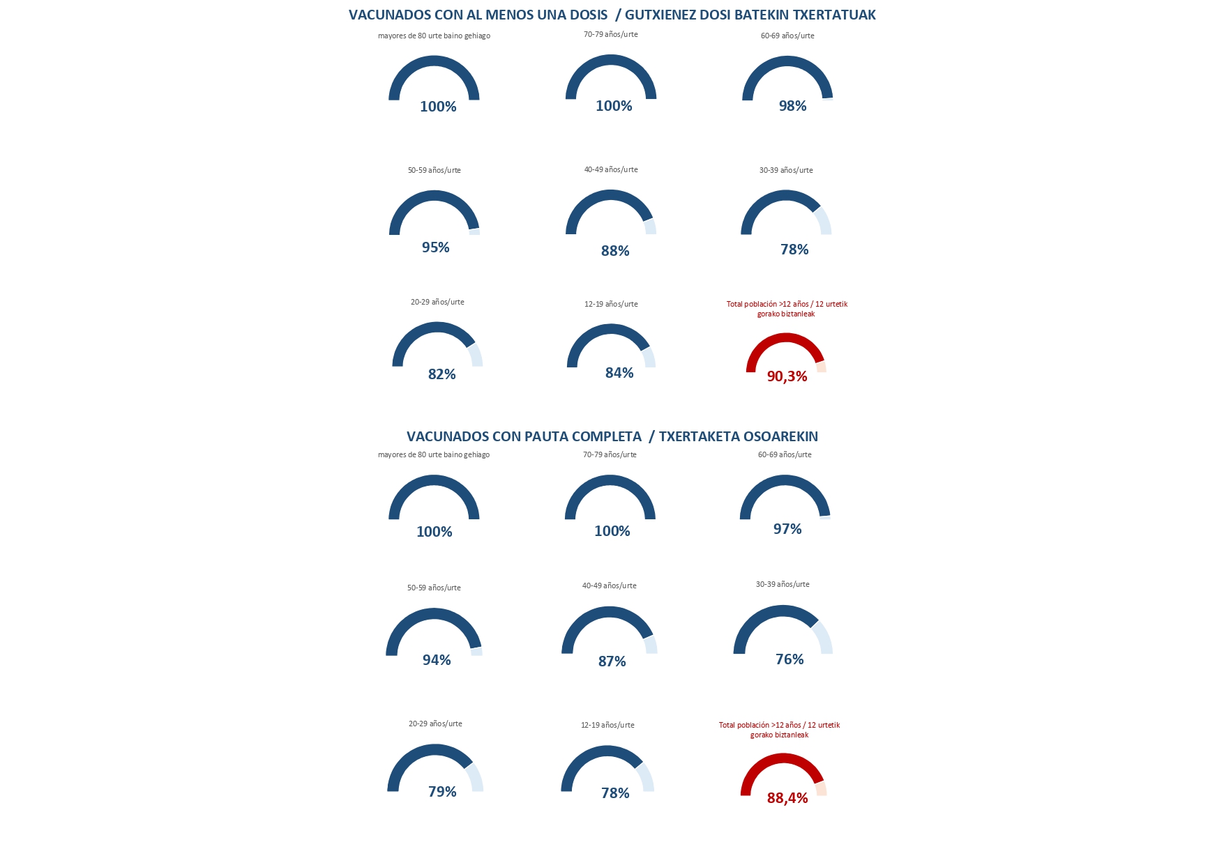 En cuanto a la cobertura por grupos de edad, se ha administrado la pauta completa al 100% de mayores de 80 años y al mismo porcentaje de los de 70 a 79 años. Además, tienen la pauta completa el 97% de los de 60 a 69 años; el 94% de los de 50 a 59 años; el 87% de 40 a 49 años; el 76% de 30 a 39 años; el 79% de 20 a 29 años; y el 81% de 12 a 19 años.