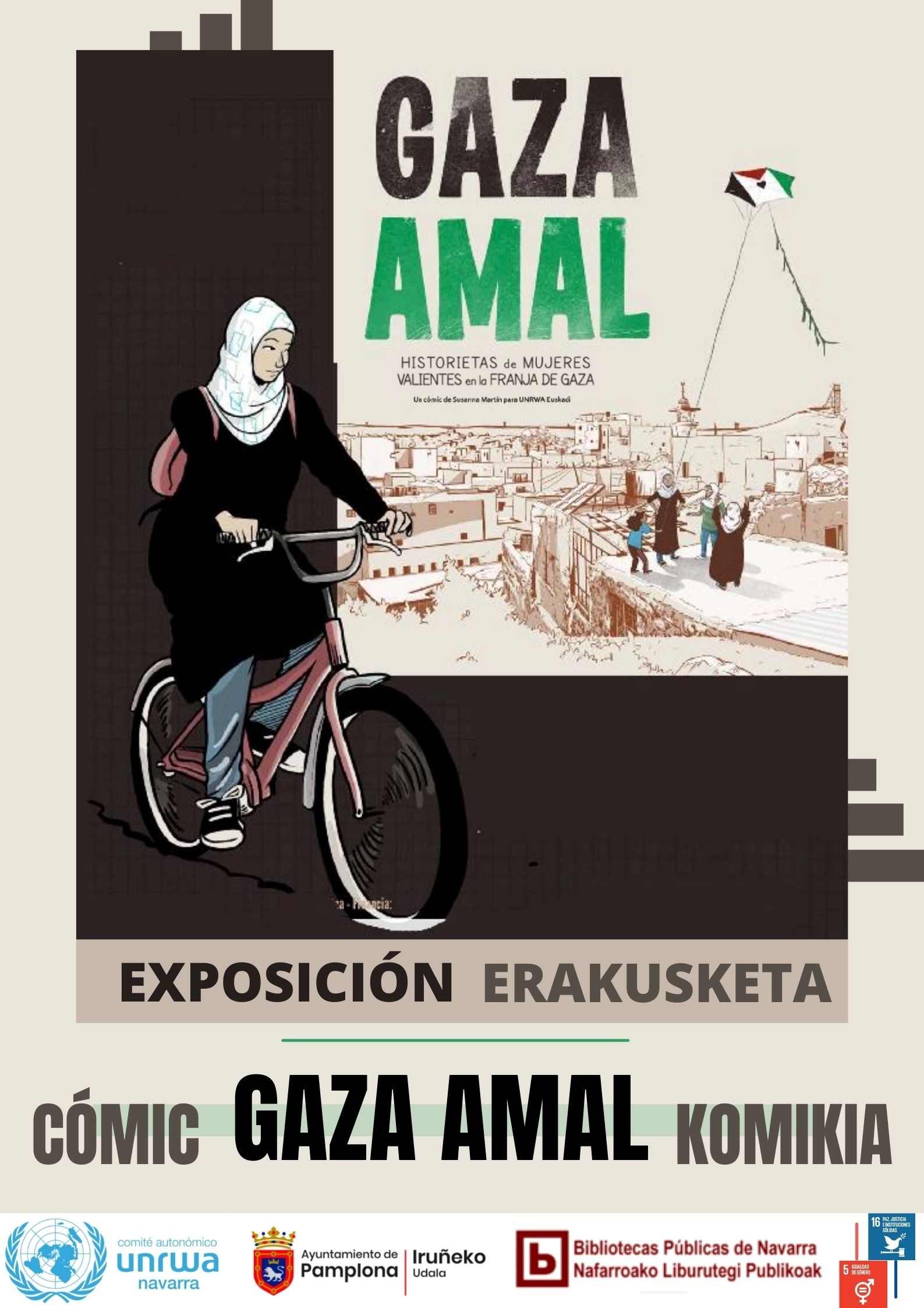 En Pamplona, las bibliotecas de Milagrosa, San Jorge y San Francisco ofrecerán, a partir de la segunda quincena de octubre y hasta el 21 de noviembre, la exposición "Gaza Amal. Historietas de mujeres valientes en la franja de Gaza". La iniciativa, realizada en colaboración con el Comité autonómico de UNRWA (Agencia de la ONU para los refugiados), incluye una charla explicativa. Se repartirán ejemplares de cómic entre las personas que la visiten.