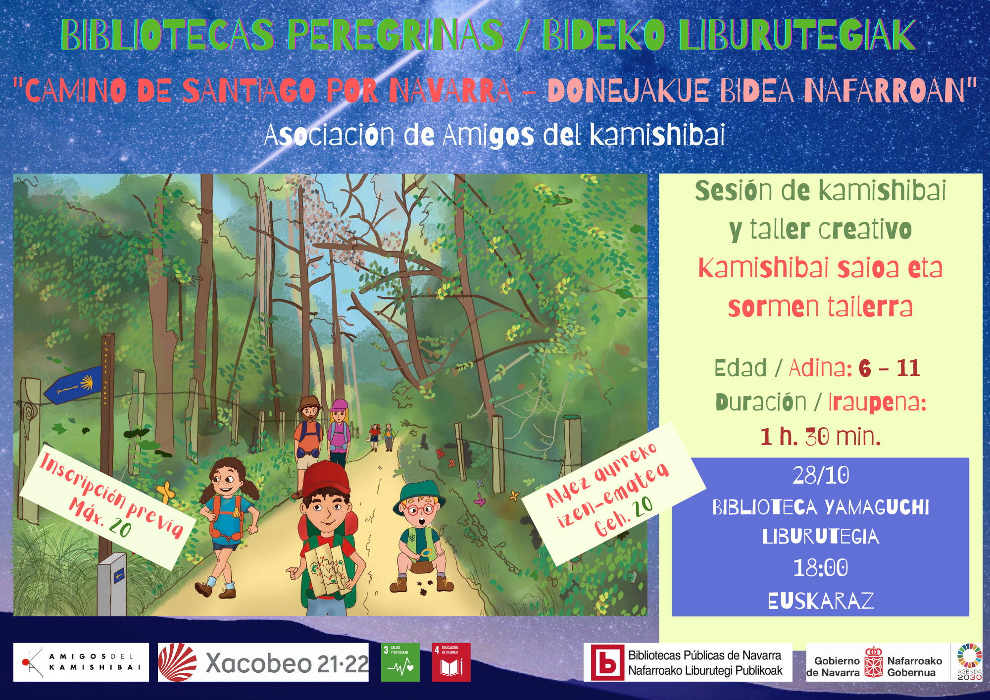 Con motivo de la celebración del Año Xacobeo 2021-2022, trece bibliotecas de Navarra participan en el proyecto “Bibliotecas peregrinas”, que consiste en dos propuestas de animación lectora. La primera consiste en la representación del kamishibai “Camino de Santiago por Navarra / Donejakue Bidea Nafarroan”, en colaboración con la Asociación de Amigos del Kamishibai, además de la realización de un taller de elaboración de un imán con motivos del Camino.