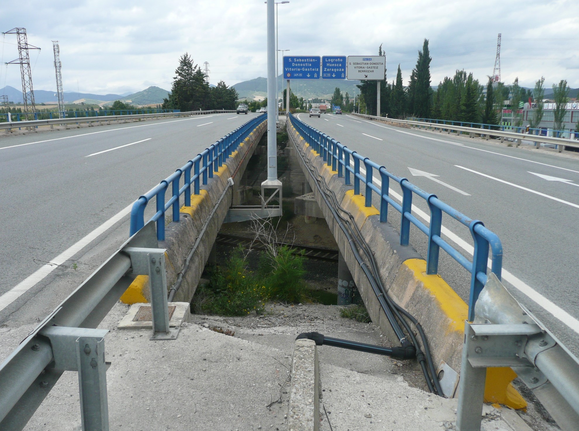 El puente, levantado en 1976 sobre la línea Pamplona-Altsasu / Alsasua de ferrocarril dentro de las obras de construcción de la Autopista de Navarra, consta de dos tableros diferenciados soportando cada uno de ellos una calzada de la vía desdoblada PA-34.