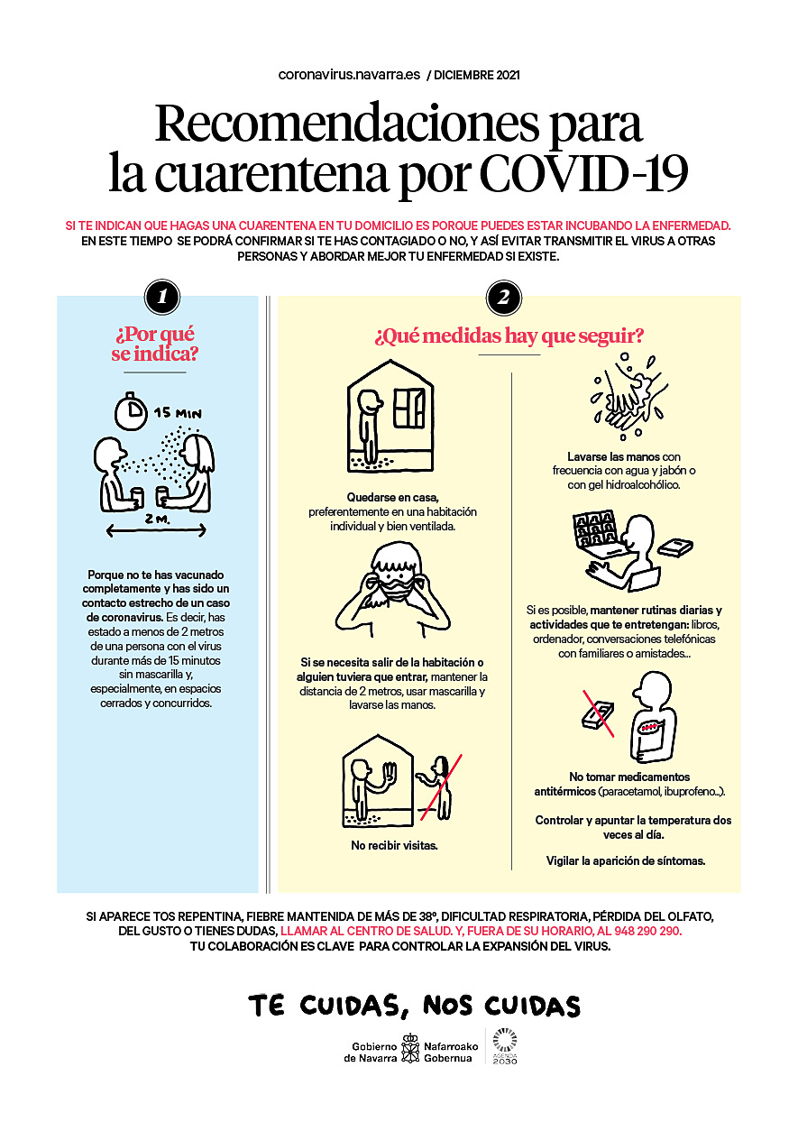 Si aparece fiebre, tos, dificultad respiratoria o tienes dudas o problemas para realizar la cuarentena, llama al centro de salud o, fuera de su horario, al Consejo Sanitario: 948 290 290.
