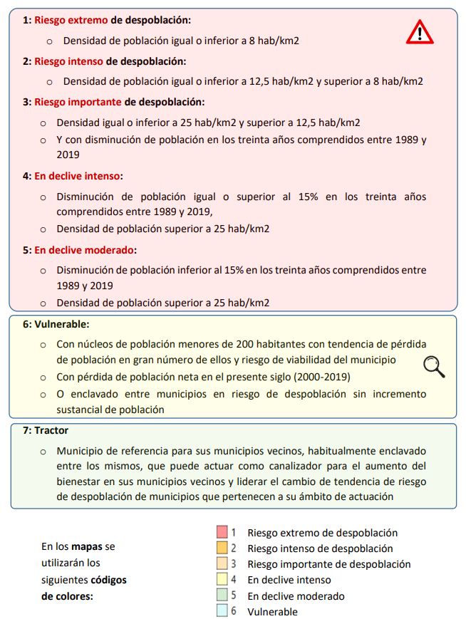 Como resultado de este análisis se aprobó la relación de municipios de la Comunidad Foral de Navarra declarados en riesgo de despoblación, y fruto de ello la siguiente zonificación en términos de despoblación, con el fin de que sirviera de base para el establecimiento de políticas de lucha contra la despoblación y el reto demográfico. Se han establecido las siguientes categorías o tipos de municipios desde el punto de vista del riesgo de despoblación: riesgo extremo, riesgo intenso, riesgo importante, en declive intenso, en declive moderado, vulnerable y sin riesgo.