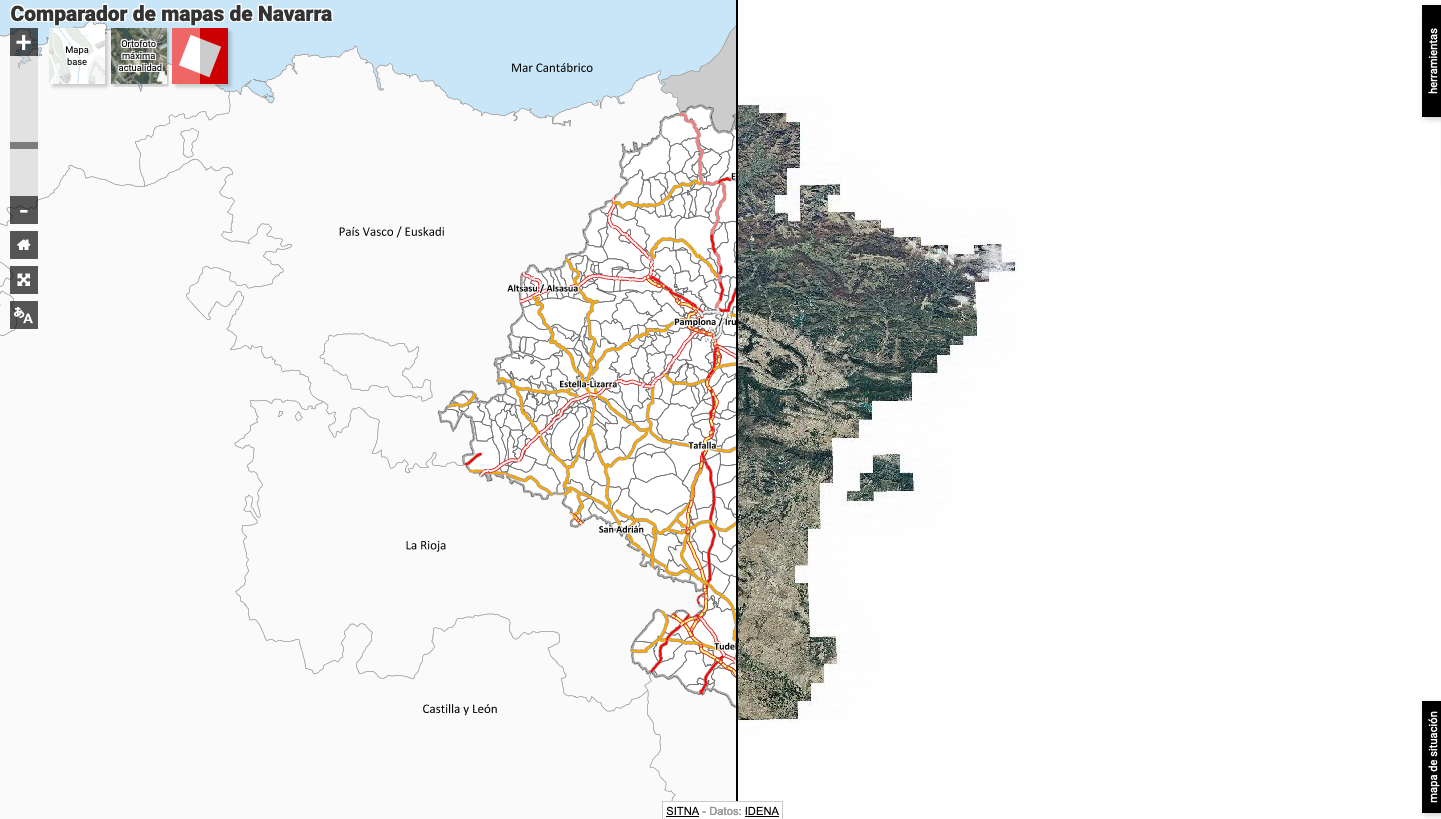 Visualizador web que a través de distintos métodos permite hacer la comparación de dos mapas diferentes en la misma pantalla. A través de transparencias, vista partida o de cortina, catalejo de tamaño configurable y serie temporal (solo ortofotos). Es la herramienta ideal para analizar cambios en el territorio a través de la mayor serie histórica de imágenes aéreas que cubren el territorio de Navarra desde el vuelo de 1927-1934 hasta la actualidad.