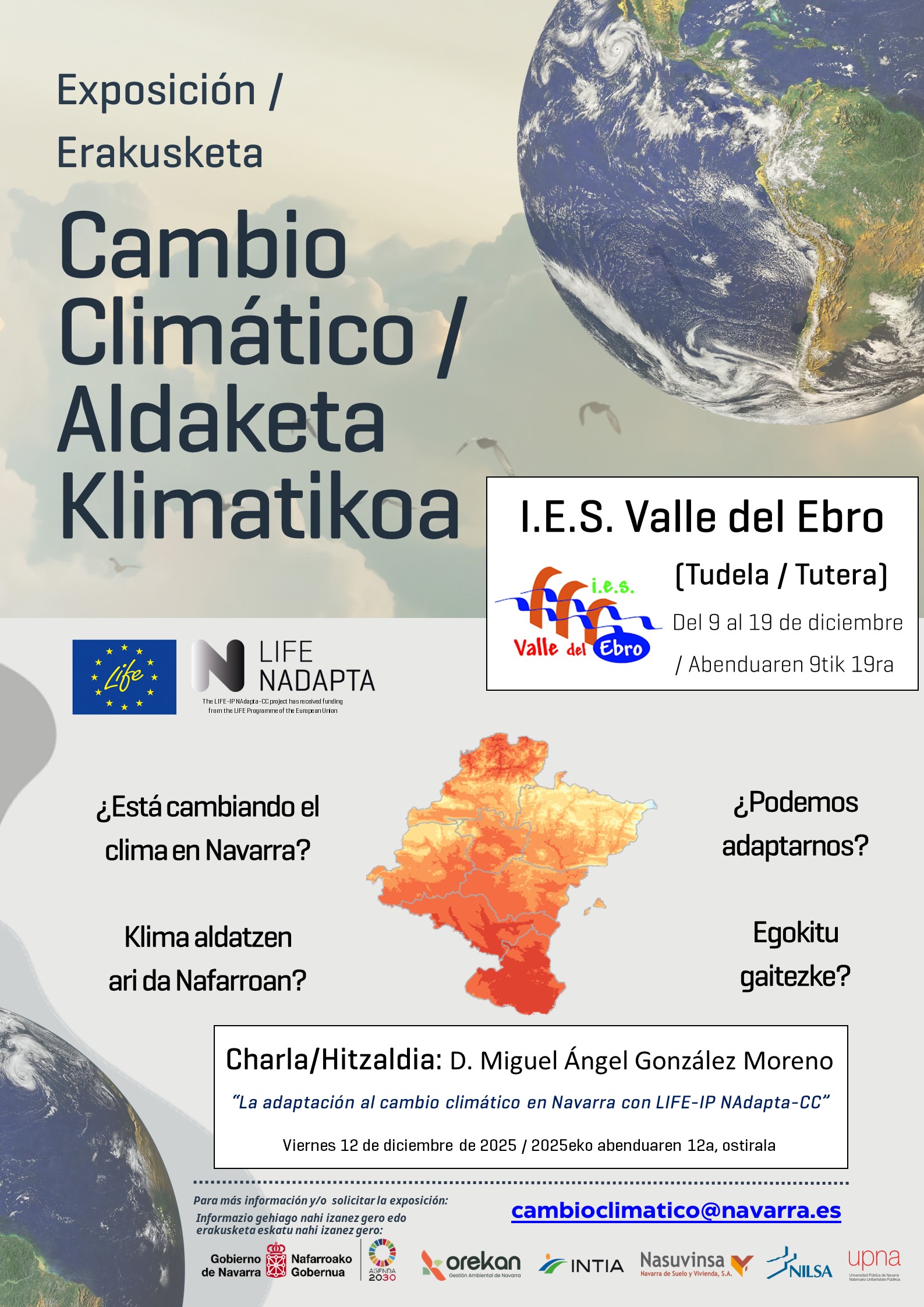 Con motivo de la cesión de la 'Exposición divulgativa LIFE-IP NAdapta-CC (Navarra y el cambio climático)' entre el 9 y el 19 de diciembre de 2025 al I.E.S. Valle del Ebro de Tudela, se celebra una jornada sobre cambio climático en dicho centro educativo tudelano dirigida hacia el alumnado durante la mañana del viernes 12 de diciembre de 2025.
