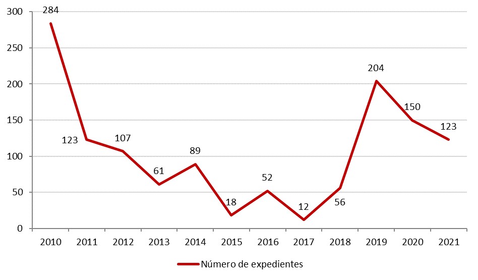 Gráfico nº 56. Evolución temporal del número de expedientes dados de alta en el Jurado de expropiación de Navarra. - memoria 2021