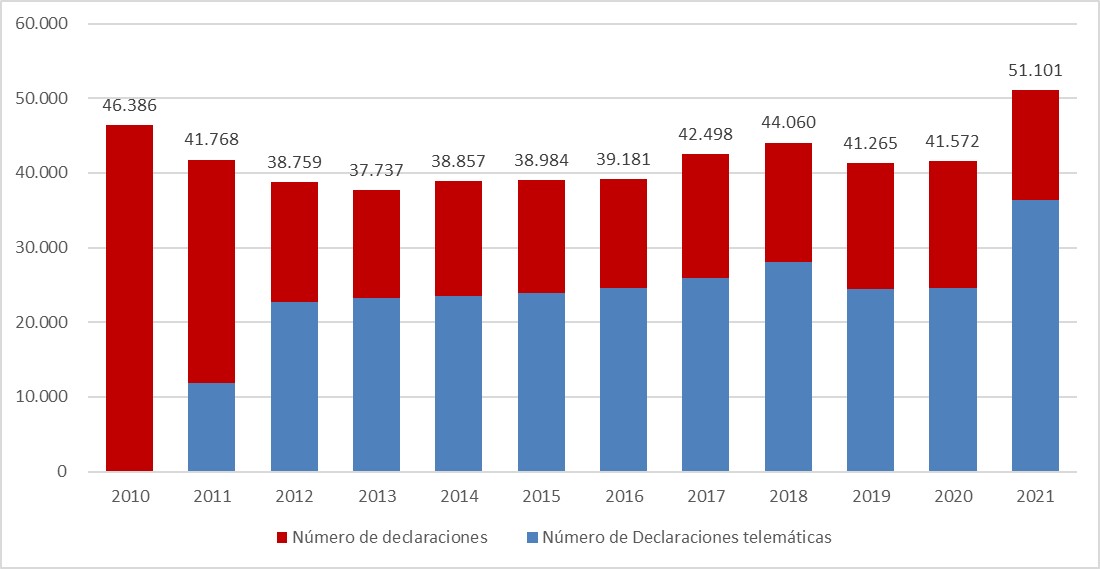 Gráfico nº 60. Evolución del número de declaraciones presentadas del Impuesto sobre Transmisiones Patrimoniales y Actos Jurídicos Documentados - memoria 2021