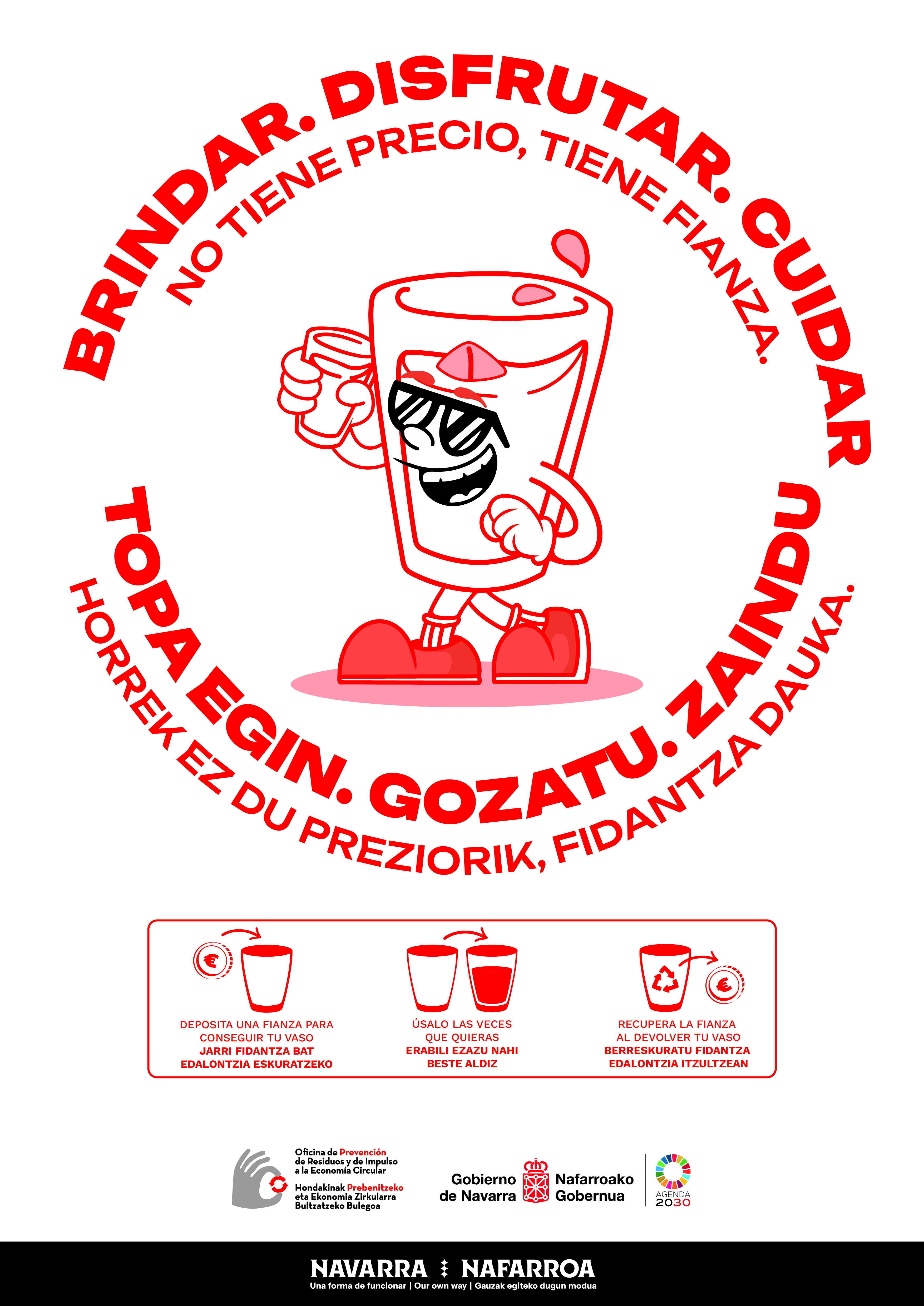 Facilitar a los agentes/entidades de la Comunidad Foral materiales para comunicar a la ciudadanía su derecho, previa fianza, a obtener un vaso reutilizable, así como su derecho a retornarlo y recuperar el importe que haya pagado como fianza, en los eventos públicos de fiestas, tal y como queda recogido en el Decreto Foral 36/2024.