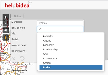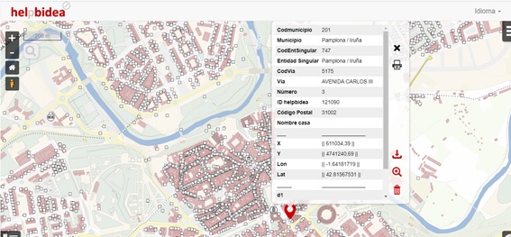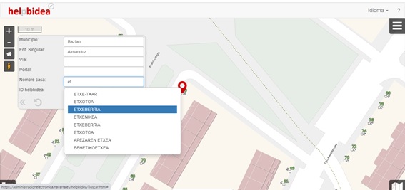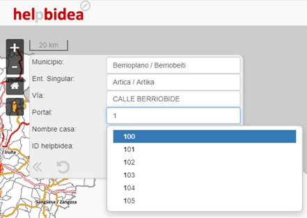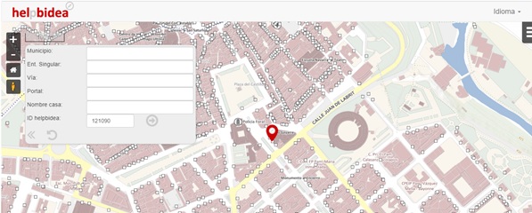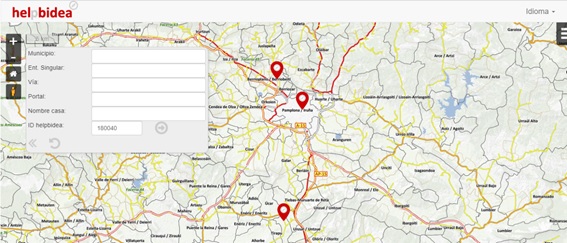 Helpbidea permite localizar una dirección postal de Navarra combinando los siguientes filtros de búsqueda: municipio, entidad singular, vía, portal, nombre de la casa e ID helpbidea, que identifica unívocamente cada edificación de Navarra.