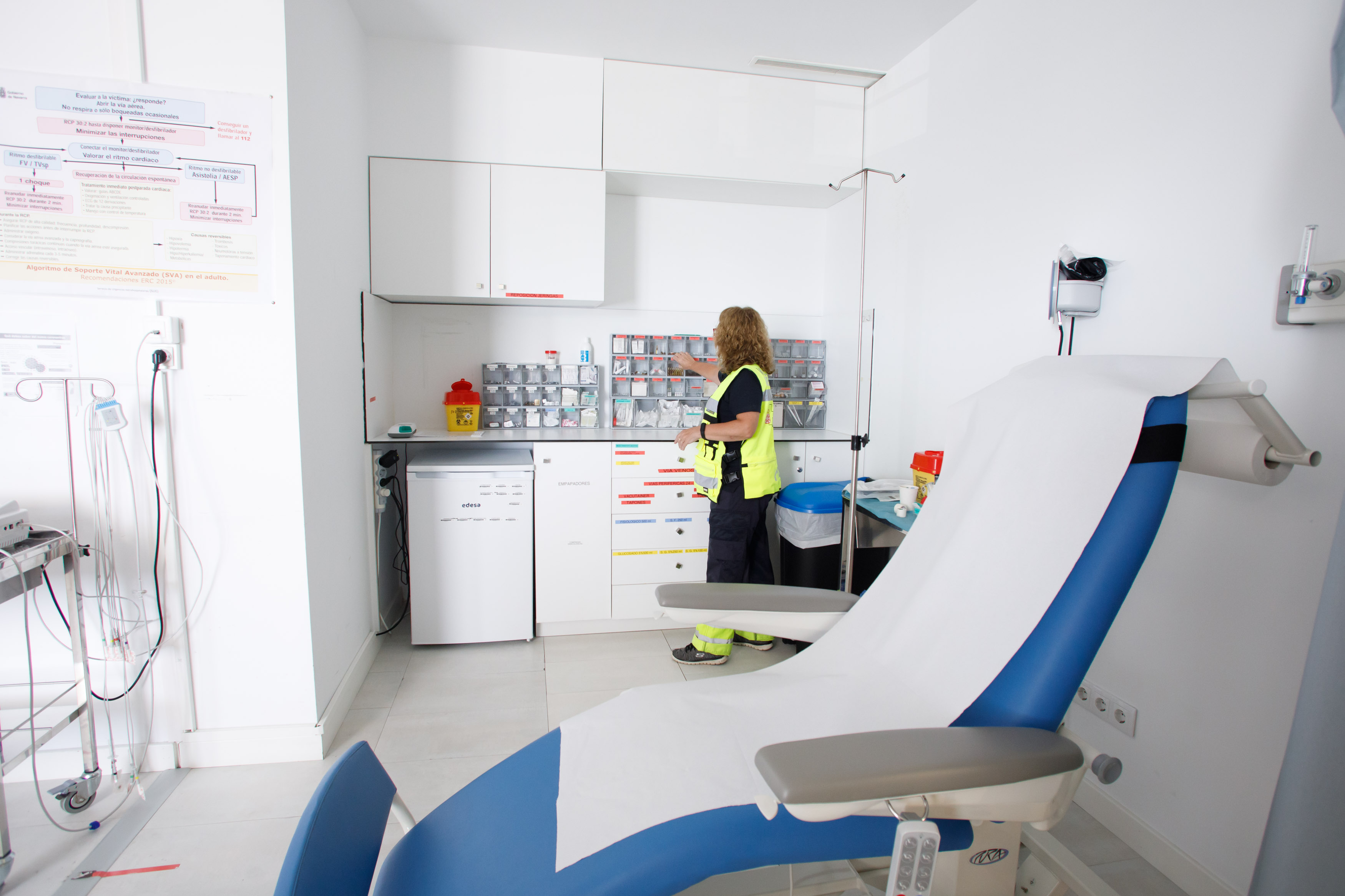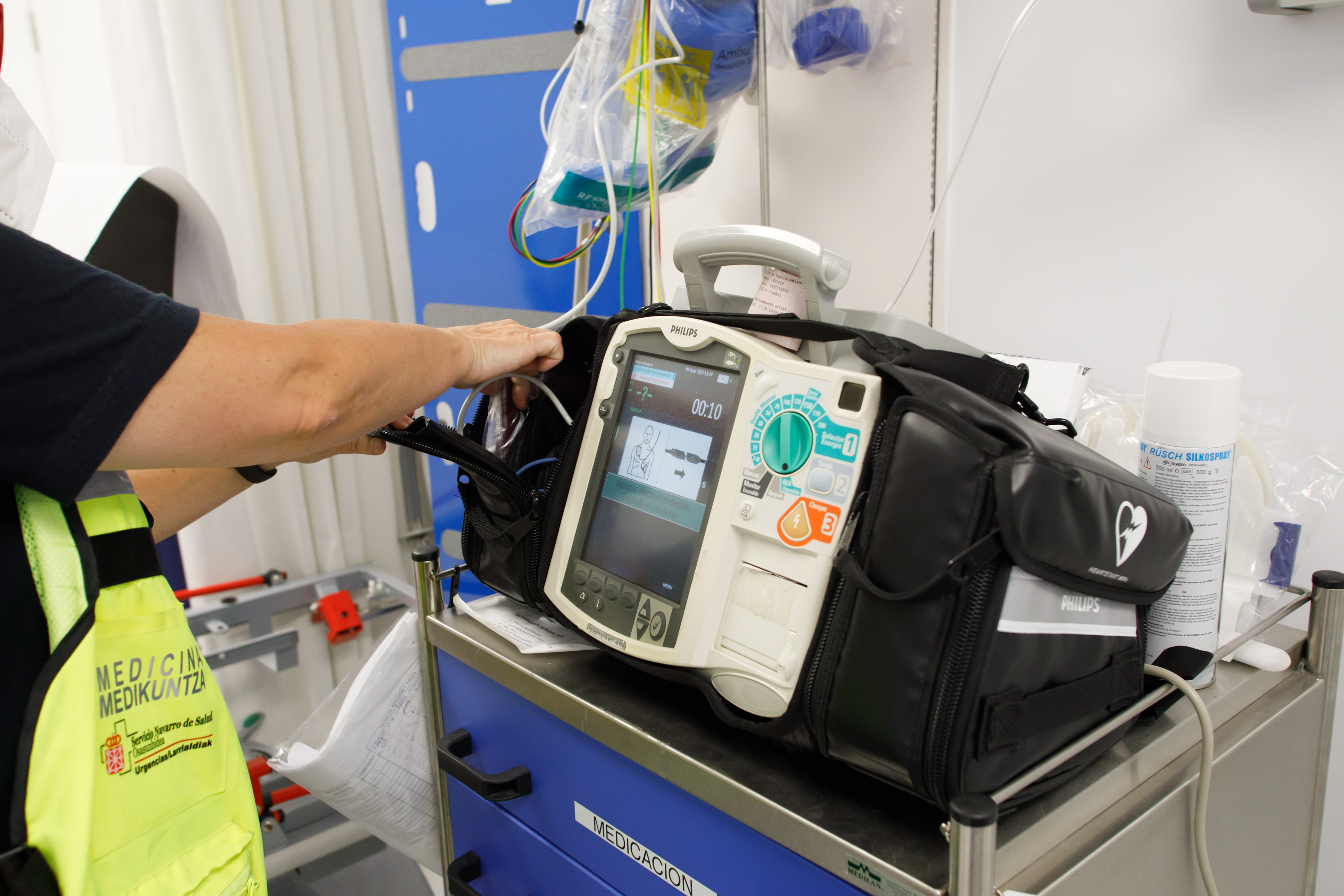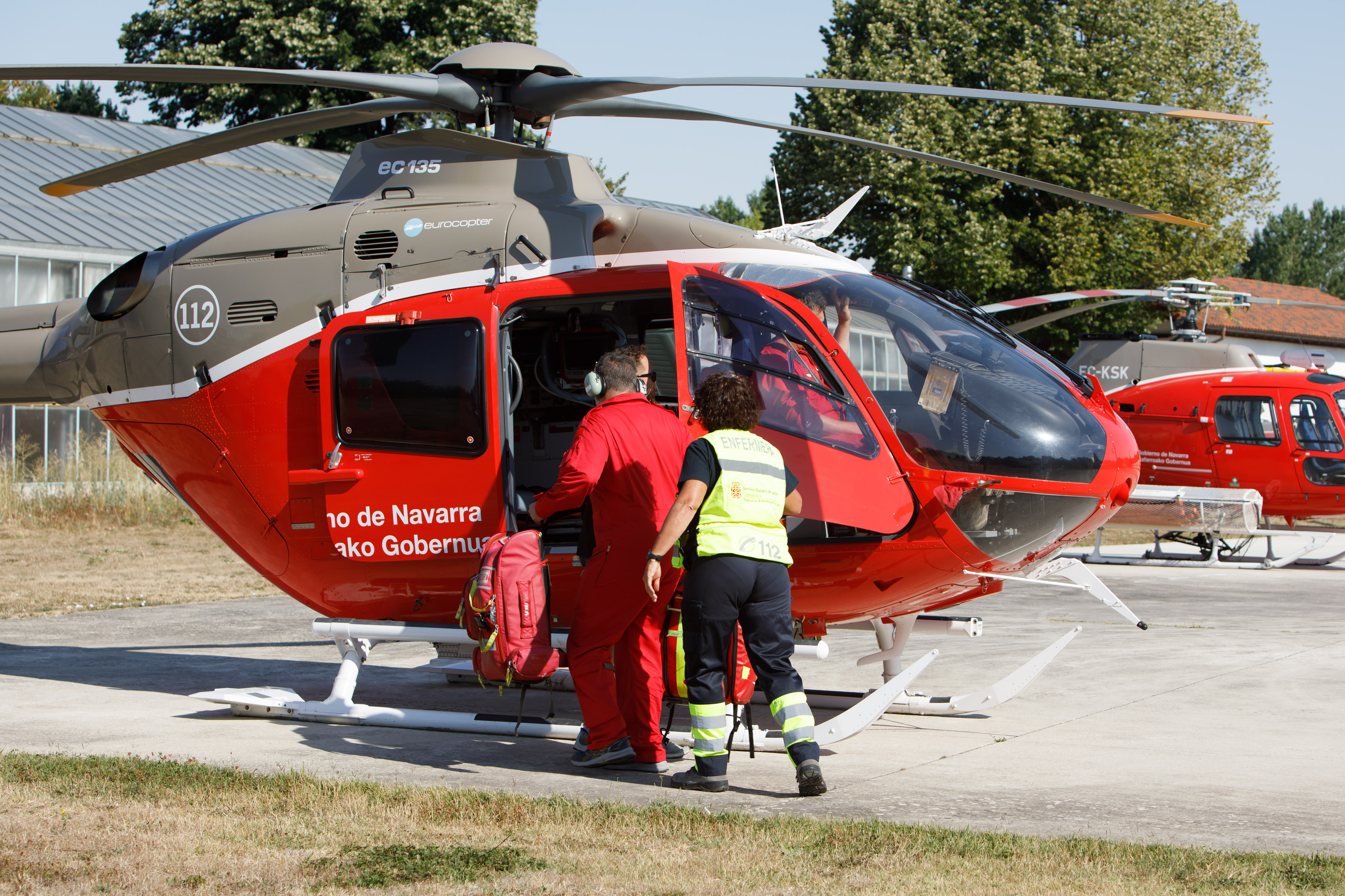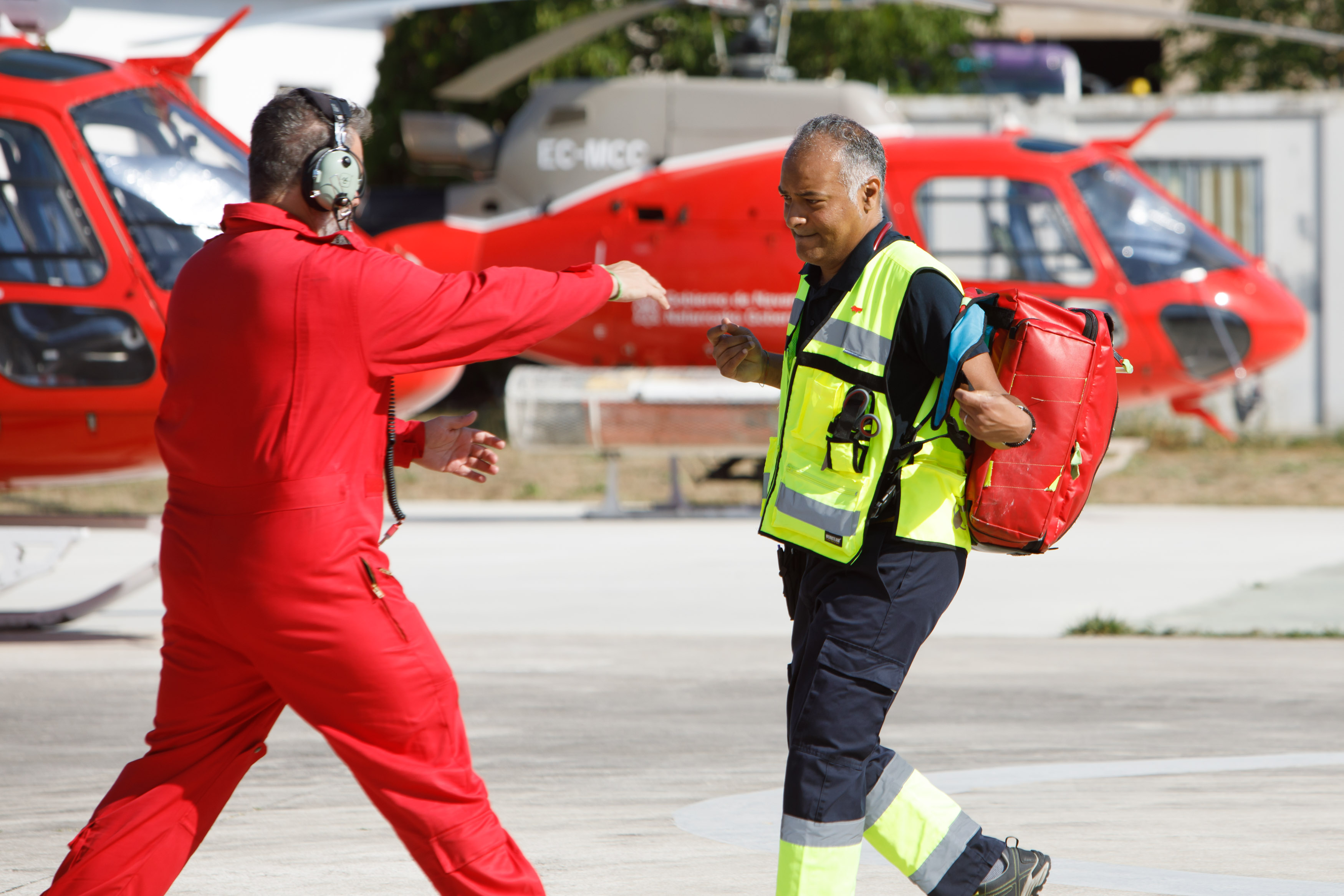 Elena Yanguas y Clint Jean Louis son enfermera y médico de la Subdirección de Urgencias Extrahospitalarias del SNS-O. Ambos profesionales forman uno de los siete equipos de soporte vital avanzado con los que cuenta el SNS-O en Navarra y uno de los que habitualmente acude a la base de Miluze para volar y acudir cuanto antes allí donde se produce una emergencia médica. El tiempo estimado para una salida, una vez el equipo sanitario de SVA está en la base, es de 3-4 minutos.