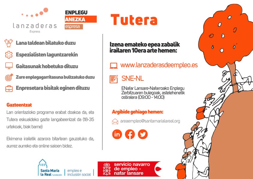 Datorren irailaren 10ean amaituko da 18 eta 35 urte bitarteko eta langabezian dauden Tuterako eta eskualdeko gazteek enplegu-anezka berri batean izena emateko epea. Nafar Lansare-Nafarroako Enplegu Zerbitzuak (Eskubide Sozialetako, Ekonomia Sozialeko eta Enpleguko Departamentuaren mendeko erakundea) eta Santa Maria la Real Fundazioak bultzatzen dute doako programa hori. Ekimen horren bidez, bi hilabetez aholkularitza jasoko dute enplegu-bilaketa aktibatzeko eta lan-aukerak handitzeko.