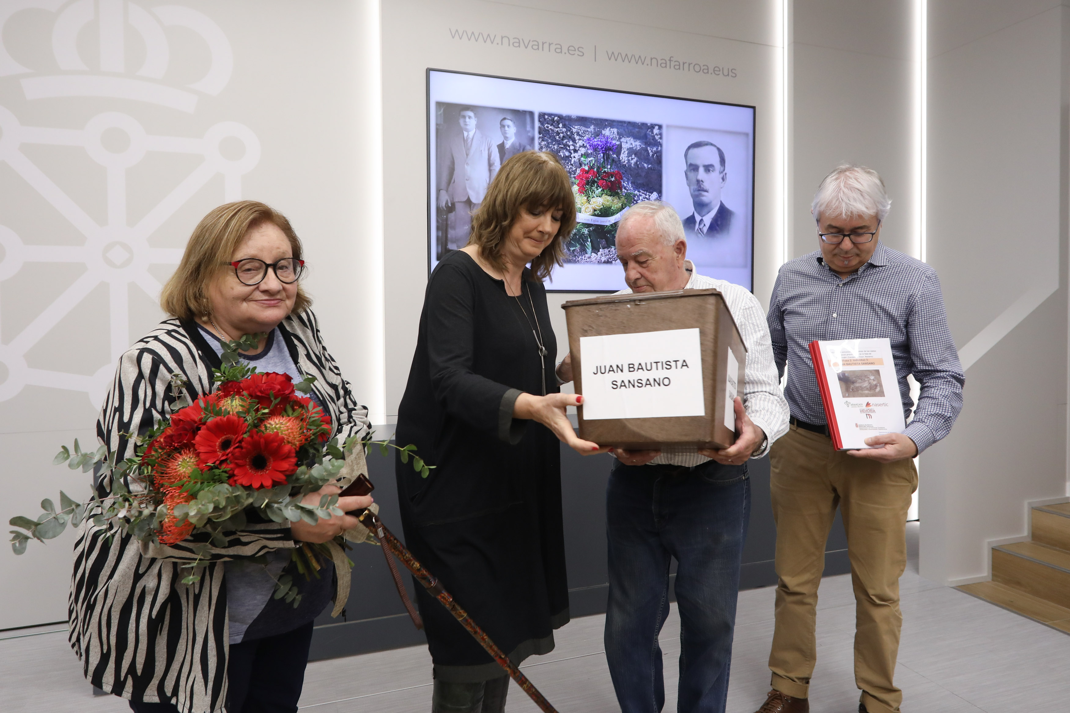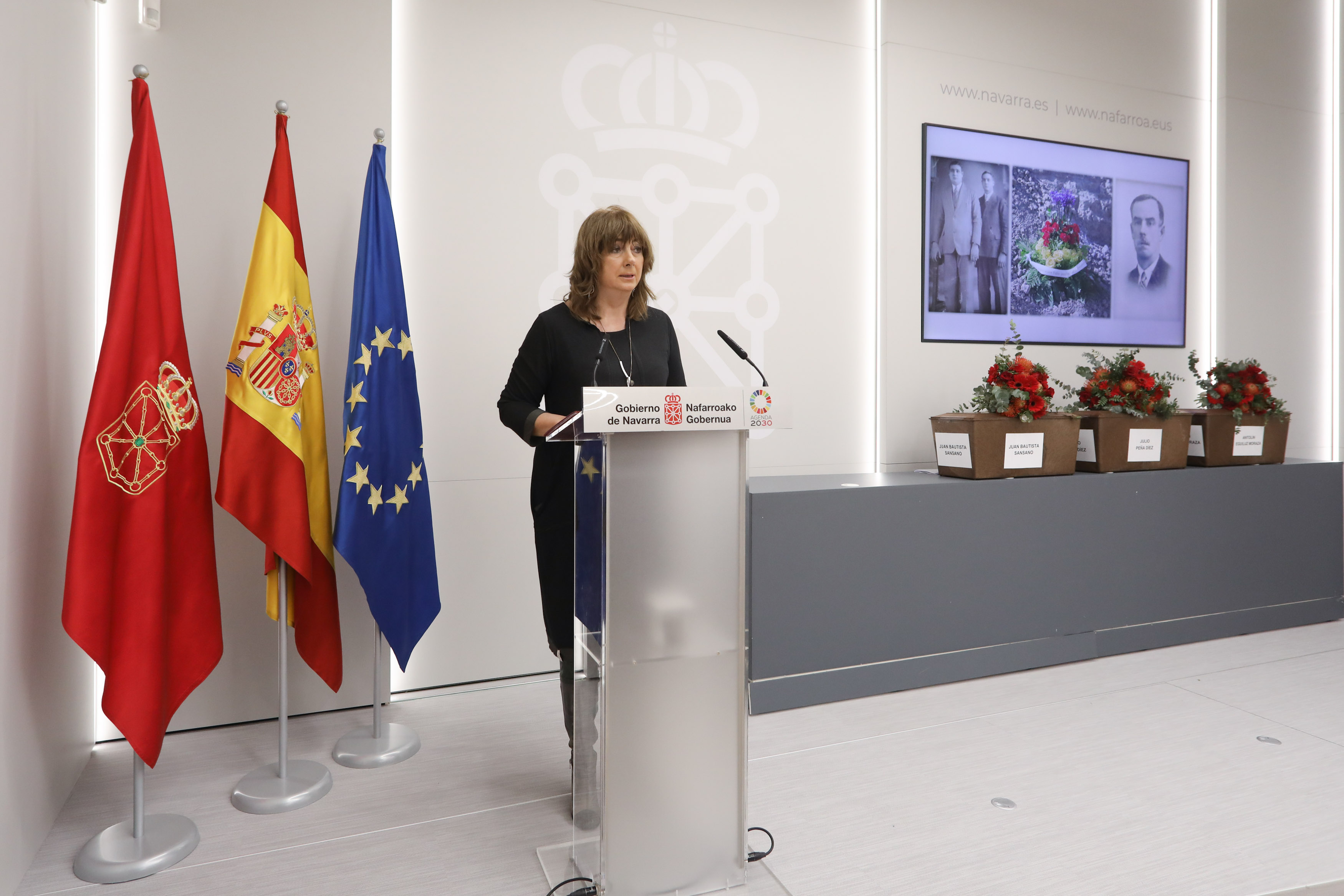 En su intervención la consejera ha recordado a los tres ferroviarios asesinados. “Hoy entregamos a sus familiares a Antolín Eguiluz Moraza, nacido en Miranda de Ebro, 51 años, casado y padre de dos hijos; Julio Peña Díez, natural de Valdeprado del Río (Cantabria); y Juan Bautista Sansano Labernia, natural de Ulldecona (Tarragona), 26 años, casado. Hoy nos acompañan las fotografías de Antolín y de Juan Bautista, no ha sido posible encontrar una foto de Julio. Tres ferroviarios, trabajadores de la Estación del Norte de Pamplona / Iruña, donde se cruzaron sus vidas pese a sus orígenes tan distantes, y donde lamentablemente se unieron también en la tragedia de su asesinato, similares a los miles que se produjeron en aquellos terribles meses que siguieron al golpe militar de julio de 1936. Sus nombres se unen ahora a los de Gregorio Albo, Manuel Serón, Julio Butrón y Francisco Velaza, quienes ya han sido devueltos a sus familias en estos últimos meses”.