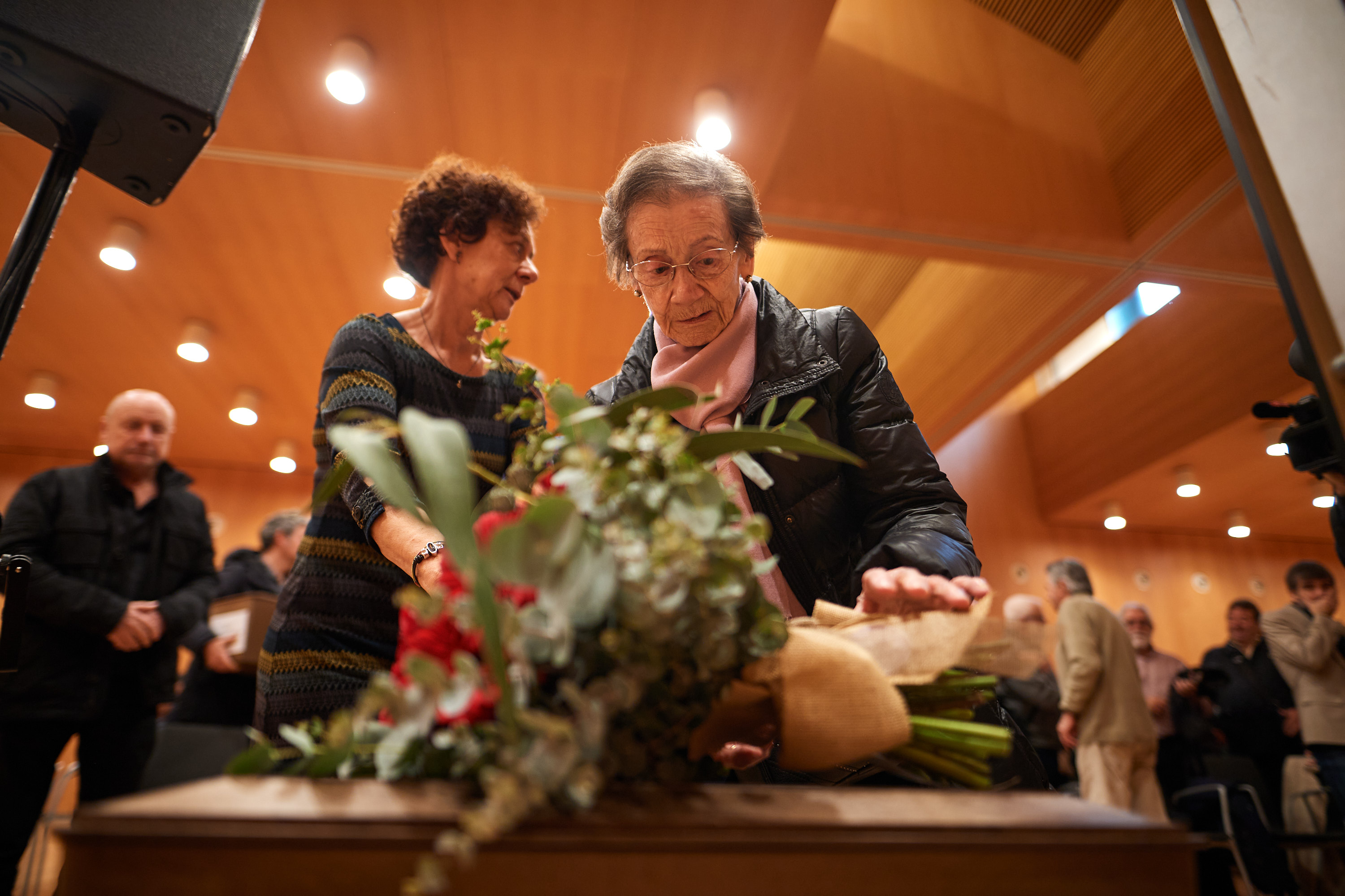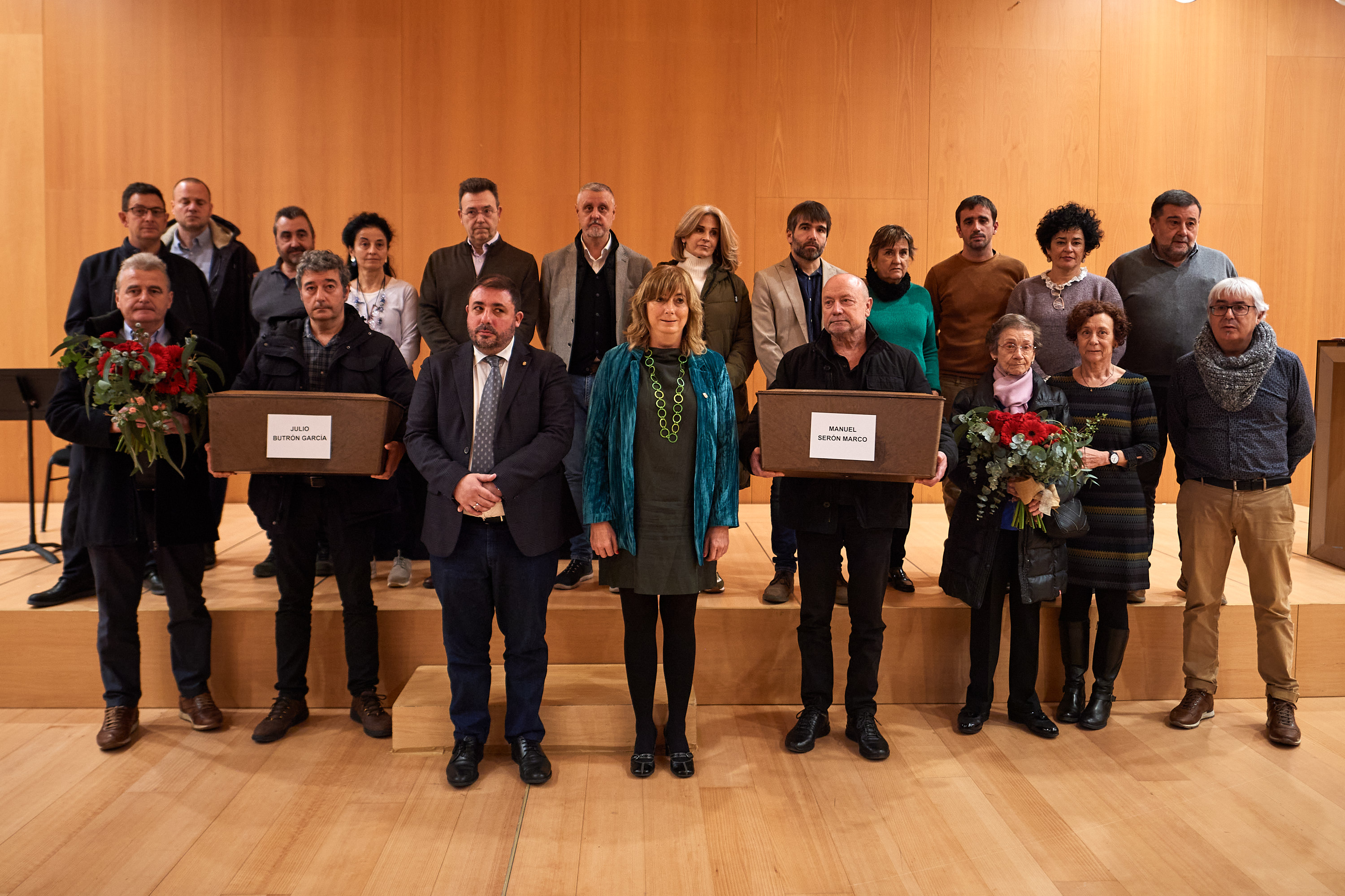 Ana Ollo kontseilaria, erdian eta Unai Uhalde Parlamentuko presidentea Julio Butrón Garcia eta Manuel Serón Marcoren familiakideekin.   Deskargatu irudia Irudi galeria