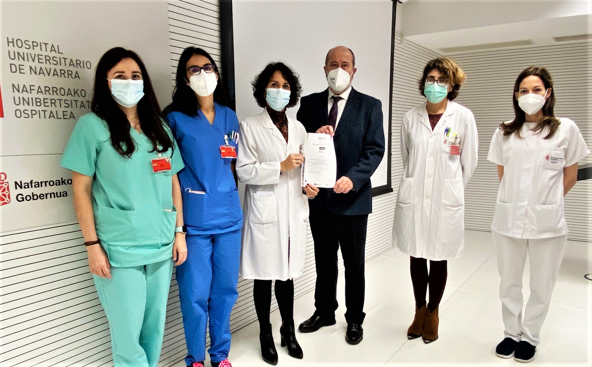 Isabel Escuer Núñez (FEA Nutrizio Klinikoko Atala), Ana Hernández Moreno (FEA Nutrizio Klinikoko Atala), Ana Zugasti Murillo (Nutrizio Klinikoko Ataleko burua), Emilio Flamarique Leoz (Nafarroako AENOR ordezkaria), Estrella Petrina Jáuregui (NUOko Asistentzia Zuzendaritza) eta Sonsoles Botella Martínez (FEA Nutrizio Klinikoko Atala).
