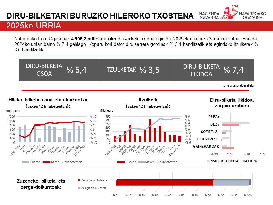 Nafarroako Foru Ogasunaren 2025eko diru-bilketa likidoa 4.995,2 milioi eurokoa izan zen urriaren 31n. 2024ko urrira arte 4.653 milioi euro sartu ziren, eta horrek esan nahi du %7,4ko igoera izan dela urte arteko terminoetan. Garapen hori 2024ko hilabete berean erregistratutakoak baino %6,4 gehiagoko bilketa metatuaren eta %3,5 itzulketa handiagoen emaitza da.