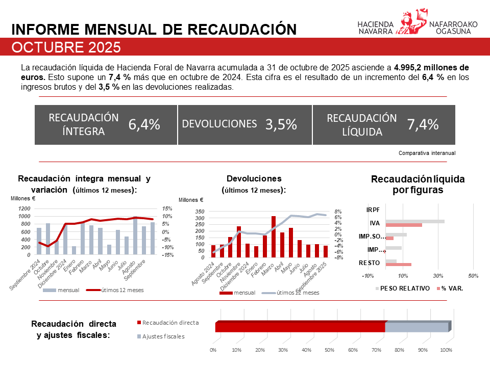 Nafarroako Foru Ogasunaren 2025eko diru-bilketa likidoa 4.995,2 milioi eurokoa izan zen urriaren 31n. 2024ko urrira arte 4.653 milioi euro sartu ziren, eta horrek esan nahi du %7,4ko igoera izan dela urte arteko terminoetan. Garapen hori 2024ko hilabete berean erregistratutakoak baino %6,4 gehiagoko bilketa metatuaren eta %3,5 itzulketa handiagoen emaitza da.