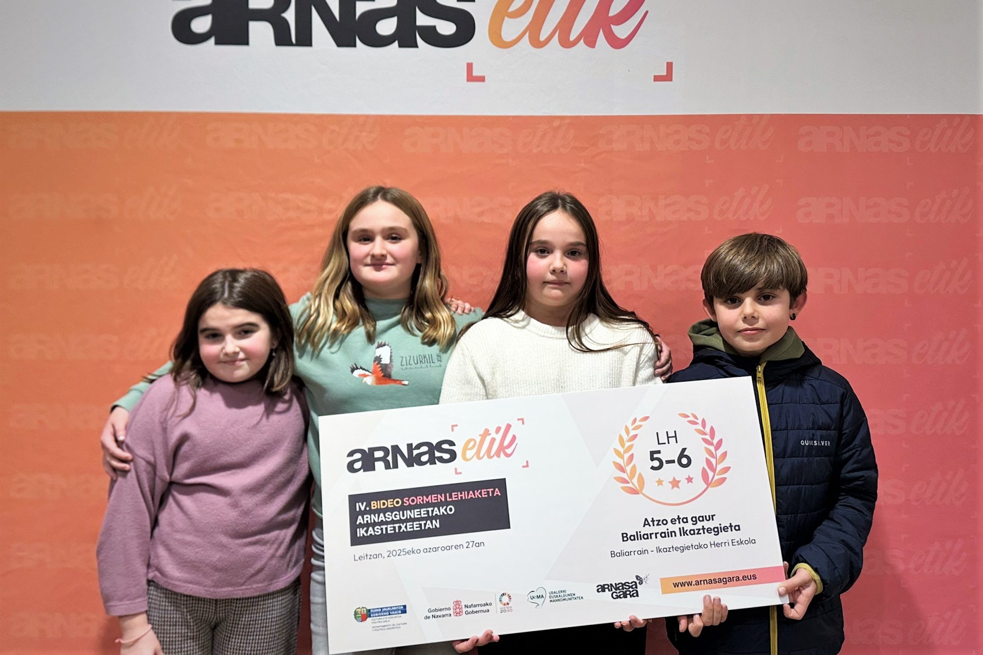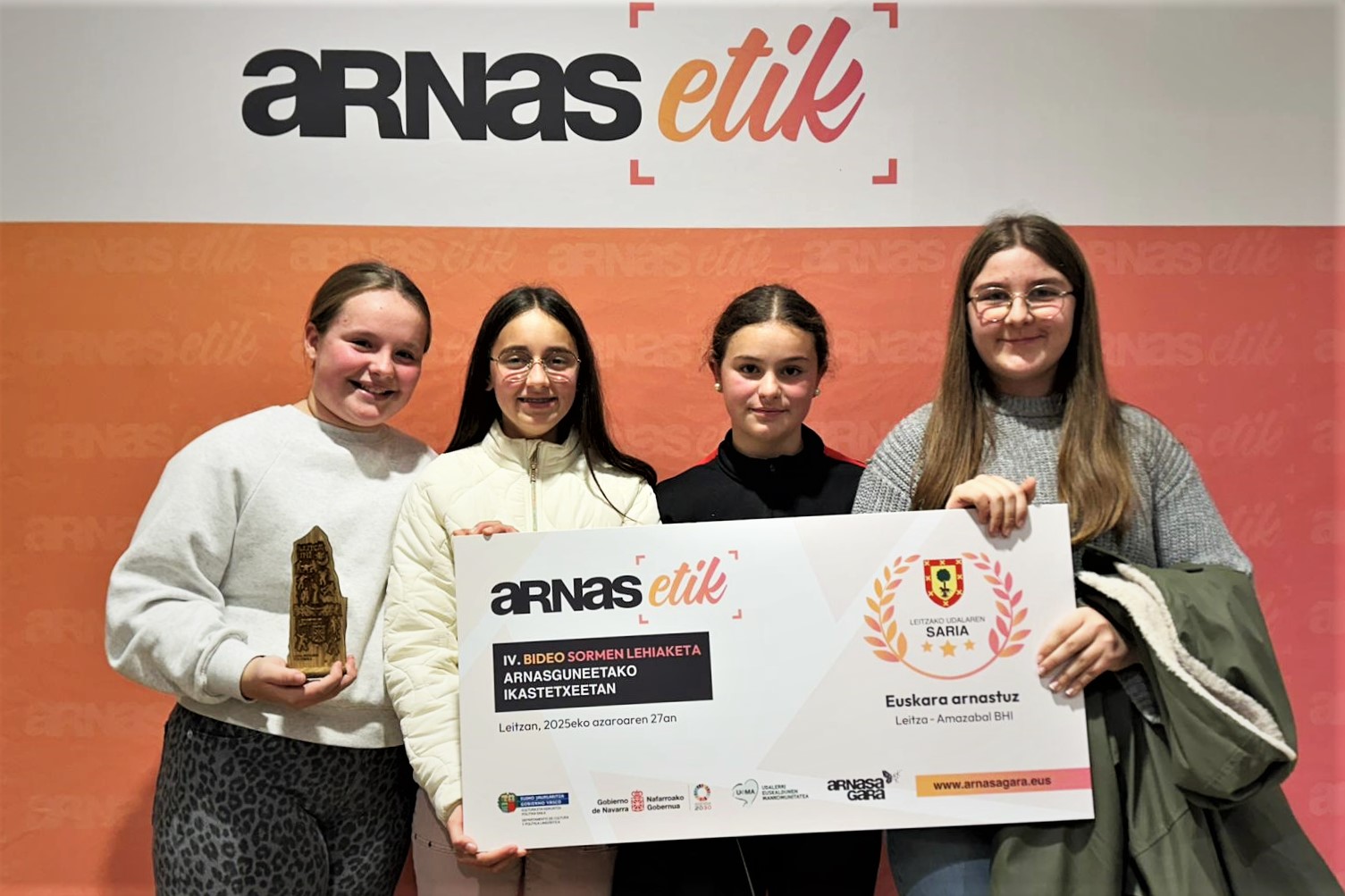 Nafarroako Gobernuak, Eusko Jaurlaritzak eta Udalerri Euskaldunen Mankomunitateak (UEMA) elkarrekin sustatutako Arnasa Gara egitasmoak ARNASETIK bideosormen lehiaketaren laugarren edizioaren sari banaketa ospatu berri du Leitzako nafar herrian. Leihaketak euskararen arnasguneetako 10 eta 16 urte bitarteko gazteen sormena eta euren hizkuntza ohituren eta herrien inguruan gogoeta pizteko helburua du. Atzo arratsaldean, bost sari banatu ziren Leitzako Herri Aretoan: kategoria bakoitzeko bana (LH 5-6, DBH 1-2 eta DBH 3-4 kategoriak), publikoaren saria eta Leitzako Udalaren saria. 2025eko edizio honetan 205 lan jaso dira 35 udalerri ezberdinetatik, eta 3.500 bozkatik gora izan ditu lehiaketak.