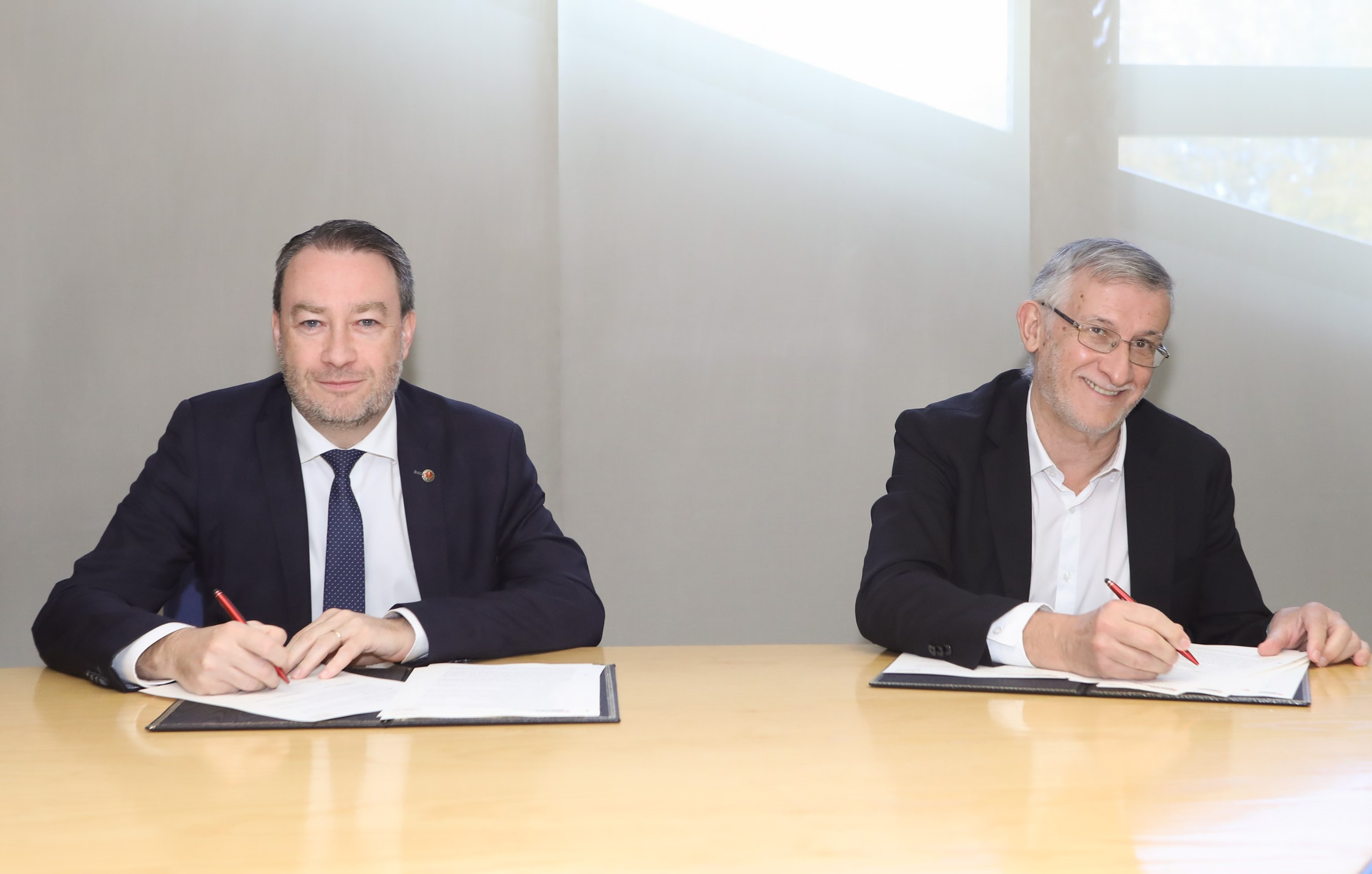 El rector de la UPNA, Ramón Gonzalo, y el vicepresidente primero y consejero de Presidencia e Igualdad, Félix Taberna, en la firma del convenio.