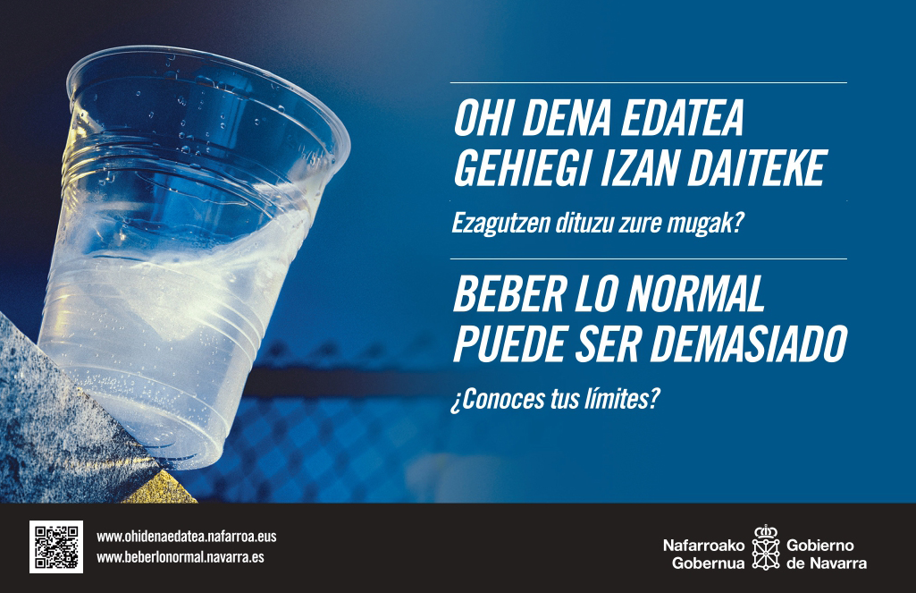 Nafarroako Lan eta Osasun Publikoko Institutuak astezkenetik aurrera, hilak 26, “Ohi dena edatea, gehiegi izan daiteke, ezagutzen dituzu zure mugak?“ kanpaina abiatuko du alkoholaren kontsumoaren inguruan gizarte hausnarketa sustatu eta sustantzia horren kontsumoak eragin ditzakeen arriskuak ezagutarazteko.