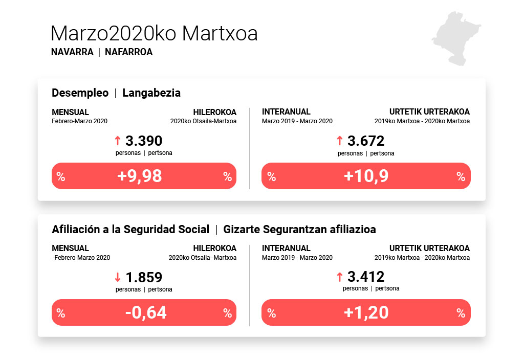 COVID-19 izurritearen ondorioek isla zuzena izan dute jada martxoan Nafarroan erregistratutako langabeziaren datuetan: 3.390 langabe gehiago izan ziren, aurreko hilean baino % 9,98 gehiago eta 2018ko martxoan baino% 10,5 gehiago.