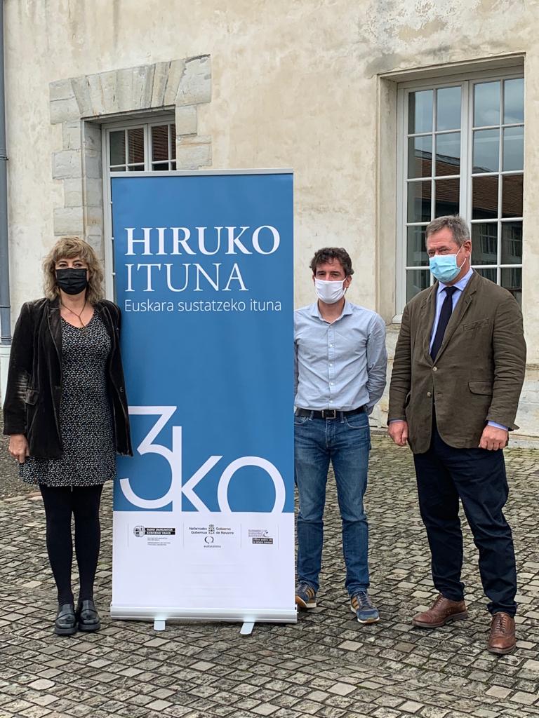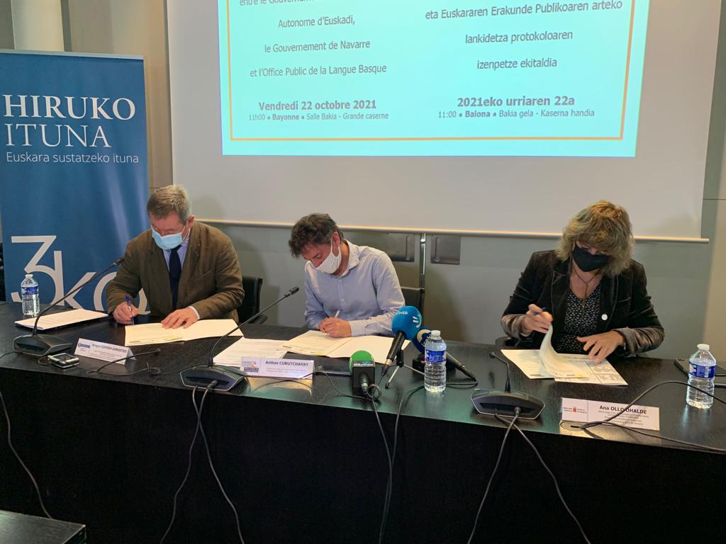 Nafarroako Foru Komunitateko Herritarrekiko Harremanetako Kontseilari Ana Ollok, Kultura eta Hizkuntza Politika sailburu eta Eusko Jaurlaritzaren bozeramaile Bingen Zupiriak, eta Euskararen Erakunde Publikoaren lehendakari Antton Curutcharryk hiru erakundeen arteko 2021-2025 urteetarako lankidetza protokoloa berritu dute euskararen sustapenean elkarlanean jarraitzeko.