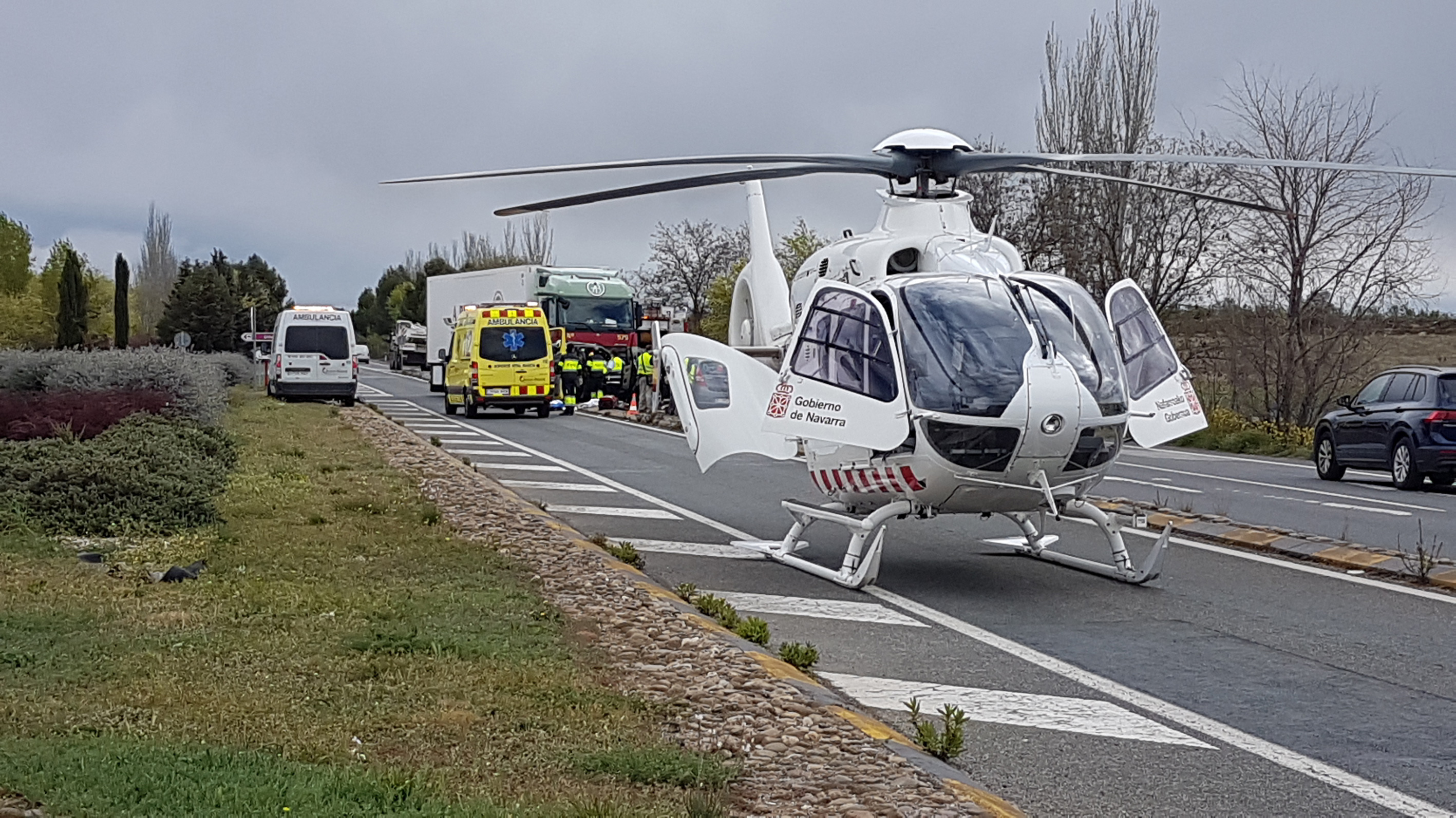 También han acudido dotaciones del parque de Bomberos de Tafalla, que han desatrapado en primer lugar a la mujer, siendo evacuada a continuación al Complejo Hospitalario en el helicóptero. Mientras tanto, los bomberos han rescatado al hombre, que conducía el vehículo y ha sido evacuado en el mismo helicóptero, que ha regresado tras dejar a la paciente en el CHN.