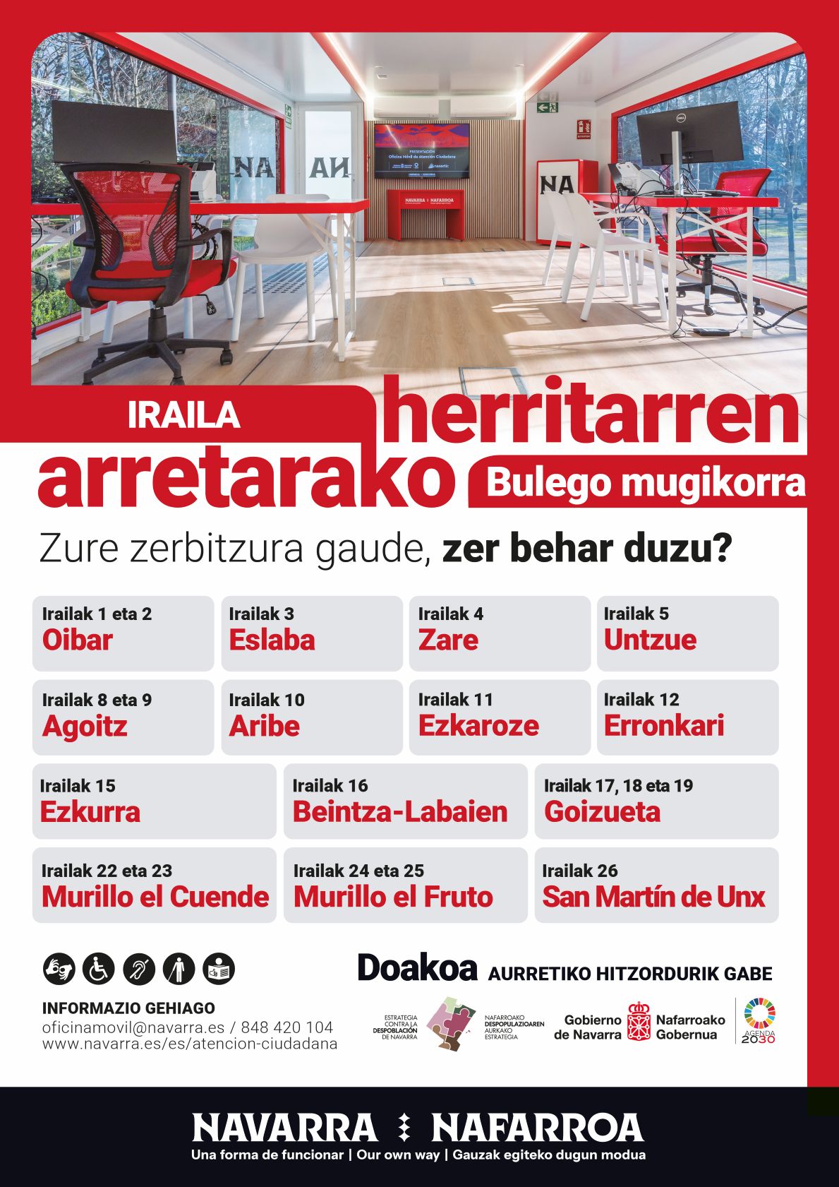 Herritarrak Artatzeko Bulego Mugikorrak irailean 14 joan-etorri programatu ditu Nafarroako 14 herritara. Zerbitzu honek “lurraldeen arteko berdintasuna eta kohesioa sustatzen ditu, despopulatzeko arriskuan dauden udalerriei Foru Administrazioarekin lotutako hainbat kudeaketa egiteko aukera eskainiz, beharrezkoak ez diren joan-etorriak saihesteko eta izapideak errazago egin ahal izateko hurbiletik, arin eta modu pertsonalizatuan”, adierazi du Lurralde Kohesiorako Departamentuko Toki Administrazioaren eta Despopulazioaren zuzendari nagusia den Jesús María Rodriguezek.