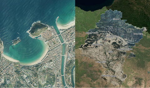 Ezkerrean: Donostiako badiaren xehetasuna. Bisorearen bidez, PNOAk eskaintzen duen Espainiako lurralde osoko argazkia ikus daiteke. Jatorrizkoa 1:1.500 eskalan. Eskuinean: irudiaren estaldura eremua.