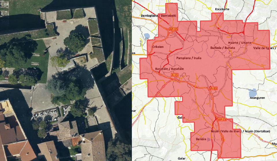 2020an Iruñerriaren gainean egindako hegaldiko xehetasun-fotogramak (benetako ortoargazkia eskuragarri dago). Hegaldi hori berezia izan zen, bost kamera fotogrametriko digital erabili zirelako (bat nadirala eta beste lauak zeiharrak ziren: iparraldea, hegoaldea, ekialdea eta mendebaldea), lurraldearen ikuspegi asko jaso zituztenak. Bereizmena 0,075 metro/pixel-ekoa da, eta hegaldia 2020ko irailaren 2an eta 3an egin zen, hegaldiaren altuera 3.200 eta 3.400 metro artekoa izan zela.