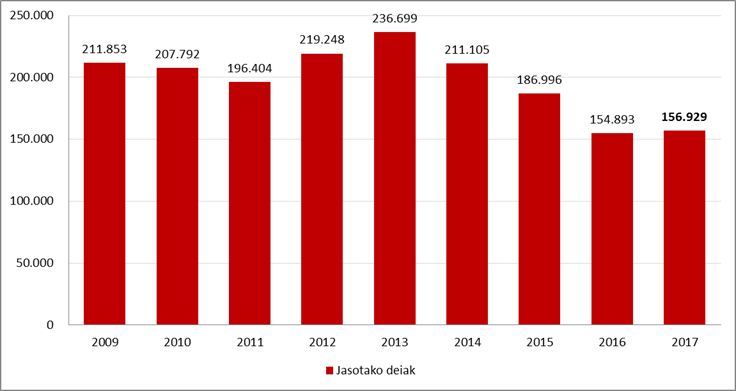 67. grafikoa. Aurkeztutako Ondare Eskualdaketen eta Egintza Juridiko Dokumentatuen gaineko Zergaren aitorpen kopuruaren bilakaera