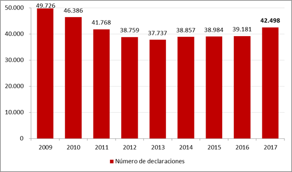 67. grafikoa. Aurkeztutako Ondare Eskualdaketen eta Egintza Juridiko Dokumentatuen gaineko Zergaren aitorpen kopuruaren bilakaera