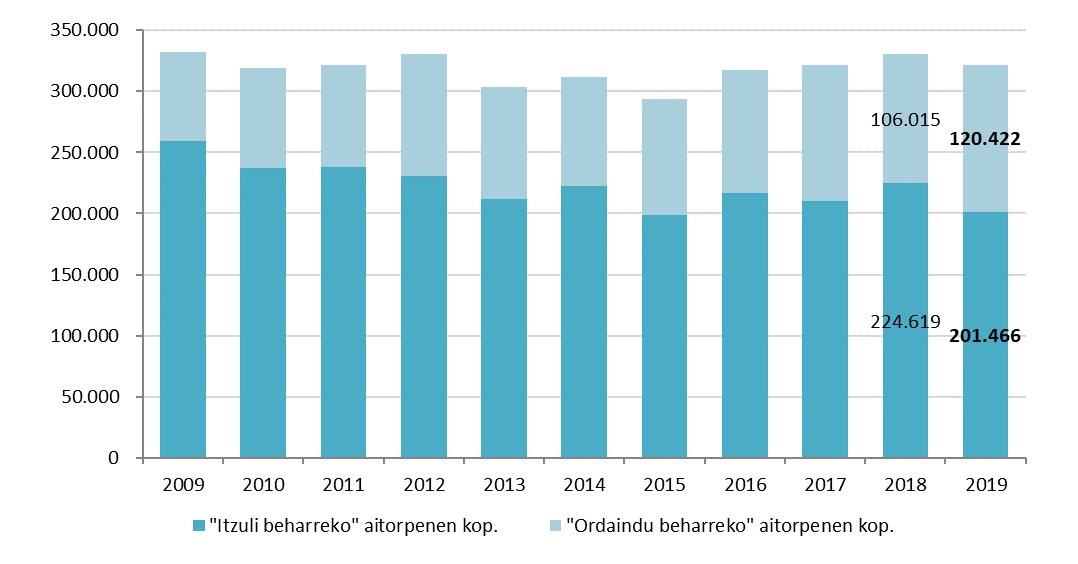 62. grafikoa. Ondare Eskualdaketaren eta Egintza Juridiko Dokumentatuen gaineko zergaren aitorpen aurkeztuen kopuruaren bilakaera