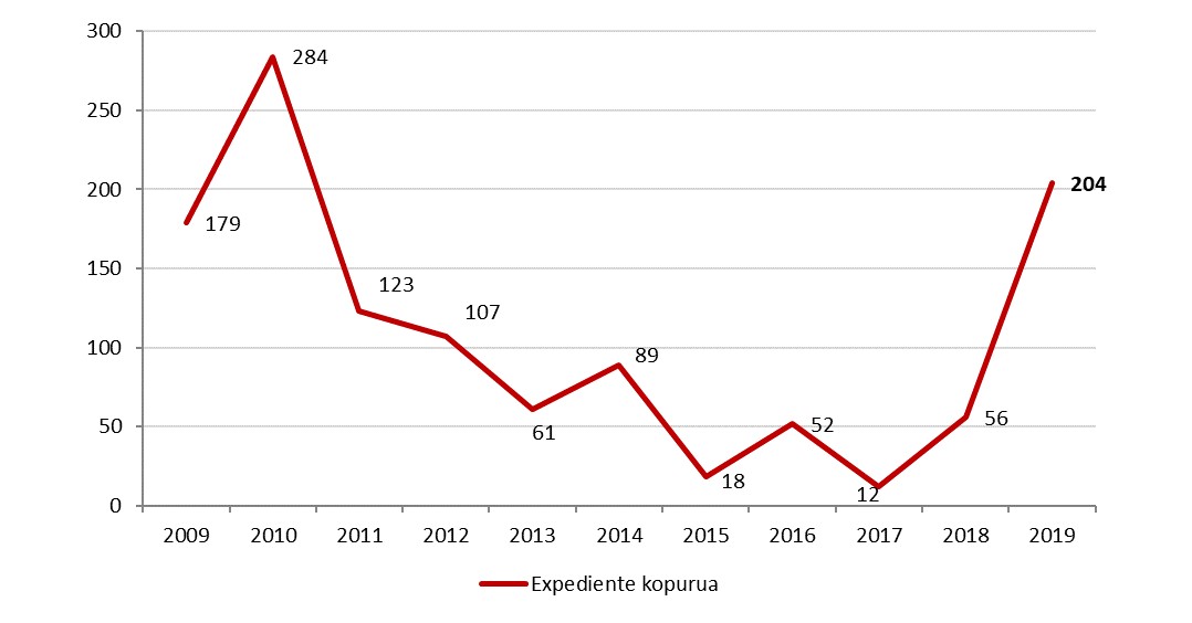 58. grafikoa. Nafarroako desjabetzeen Epaimahaian alta emandako espedienteen kopuruaren bilakaera denboran. - memoria 2019