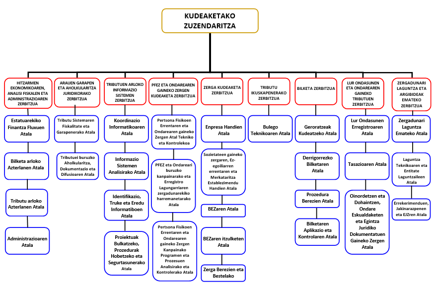 2021ean, Kudeaketa arloaren organigrama haren mendeko zuzenak diren 9 zerbitzuk osatzen dute. Zerbitzu horiek ere atal desberdinetan egituratuta daude, ondoko grafikoan deskribatzen den moduan.
