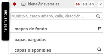 Otro método de búsqueda de capas es haciendo clic sobre la lupa, que sustituye el árbol de capas por una caja en la que introducir términos de búsqueda. Al insertar en la caja de texto al menos tres caracteres, el buscador devolverá las opciones que contienen esos caracteres tanto de las capas disponibles en el nodo IDENA como de las añadidas mediante servicios WMS. Esta opción no sólo busca en el título de la capa sino en el resumen de la misma.