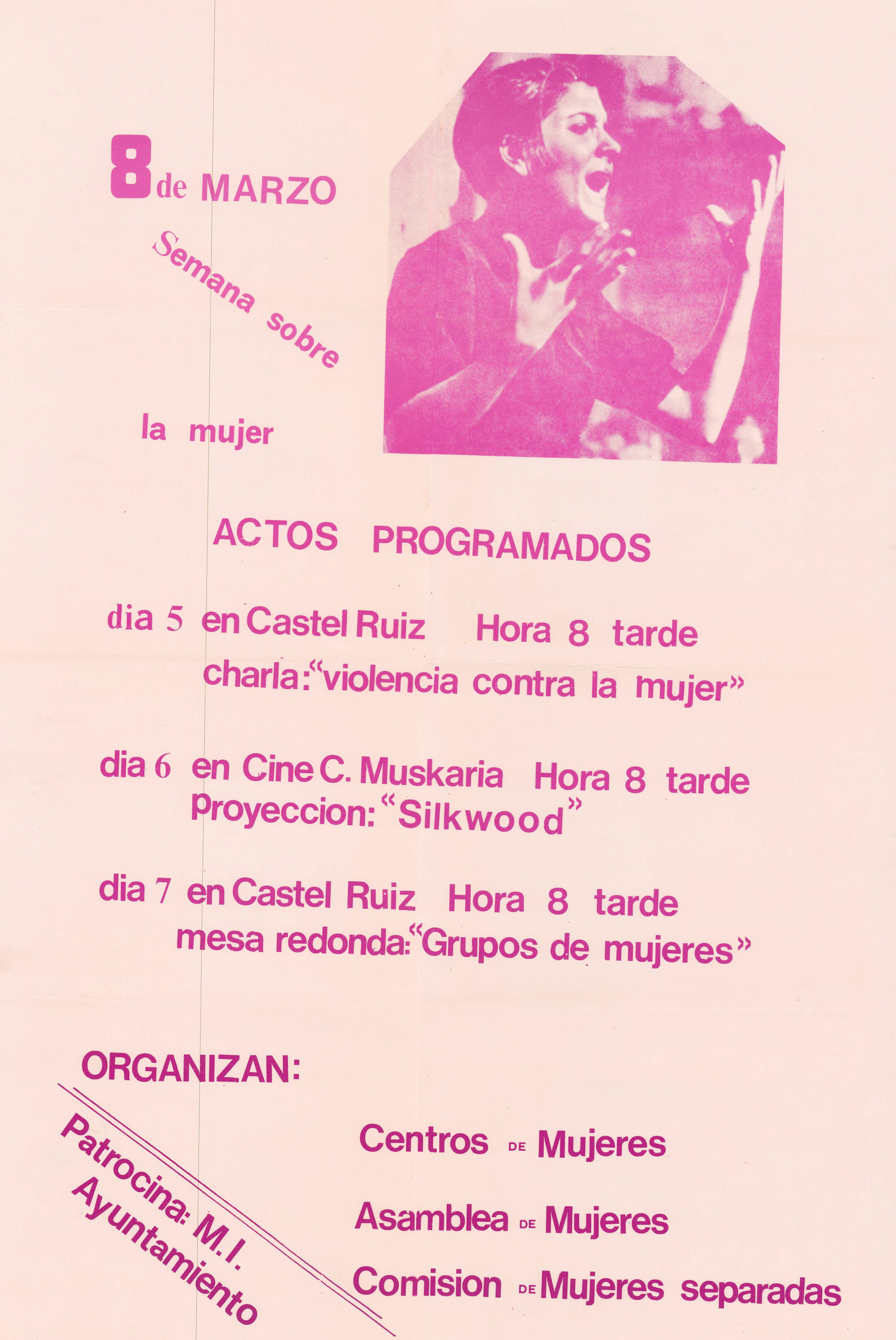 Contiene el programa de actos de una semana sobre la mujer, previos a la celebración del 8 de marzo, Día Internacional de la Mujer Trabajadora. Incluyen una charla, una proyección y una mesa redonda.