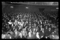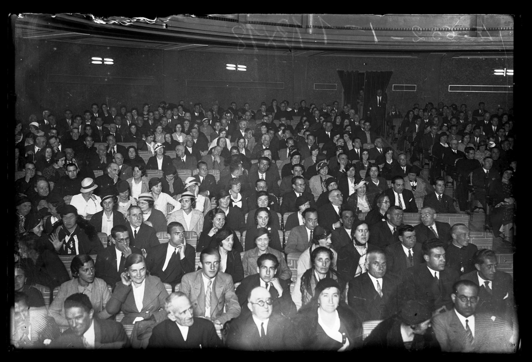 Vista general de la platea del Teatro Gayarre de Pamplona, ocupada por un público adulto de hombres y mujeres para la celebración de un acto.