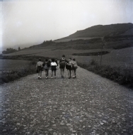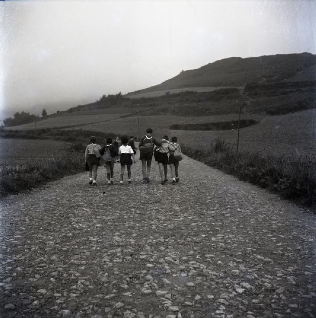 • Contenido: Vista de un grupo de 6 niños y adolescentes, uniformados con pañoleta del grupo scout de Villava, con 2 monitoras en un camino en el monte.