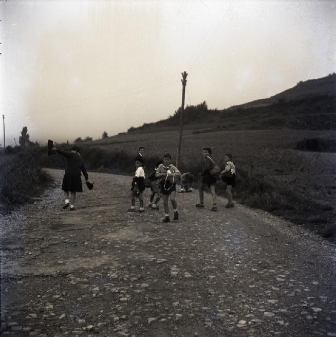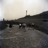 • Contenido: Vista de un grupo de 6 niños y adolescentes, uniformados con pañoleta del grupo scout de Villava, con 2 monitoras en un camino en el monte.